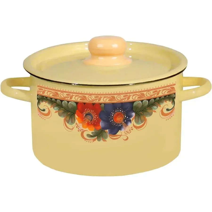 Кастрюля эмалированная 1,5л «Вологда» с крышкой, пастельный цвет, цветочный орнамент