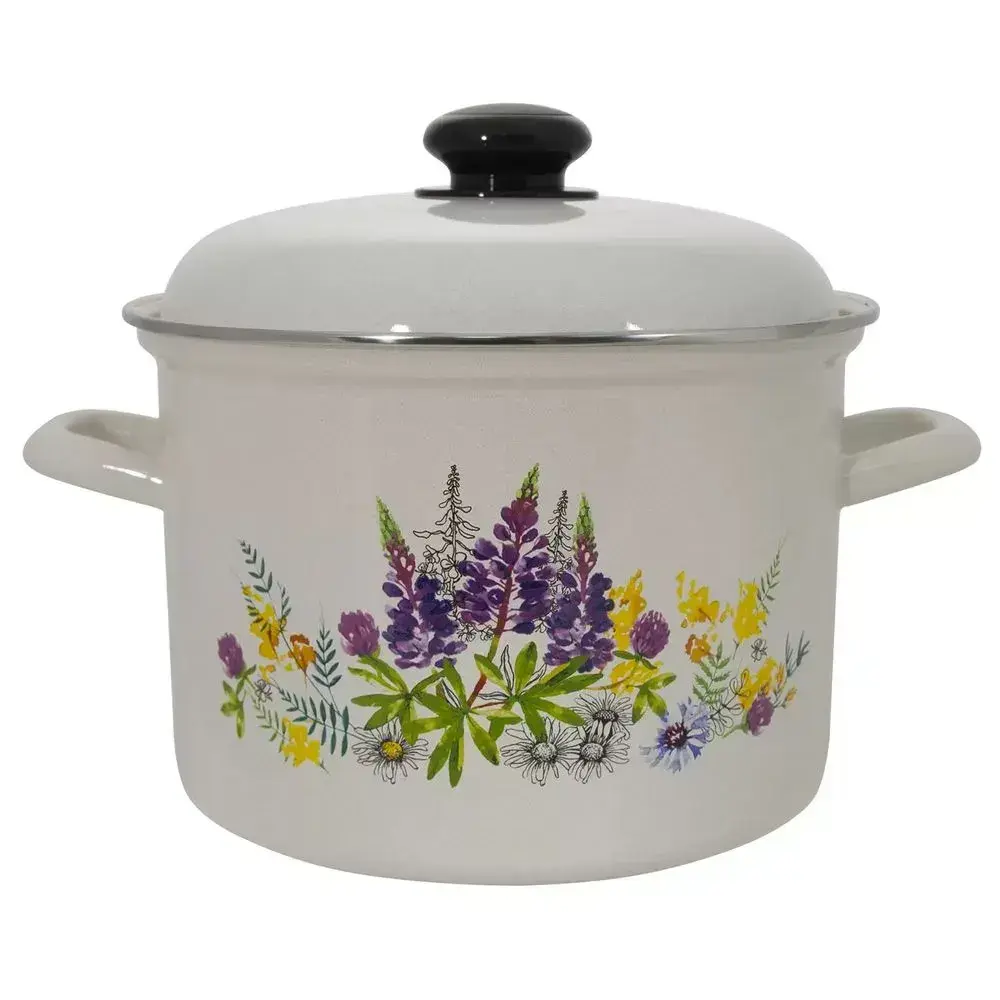 Кастрюля эмалированная 2л с крышкой, цветочный узор «Люпины», белая основа