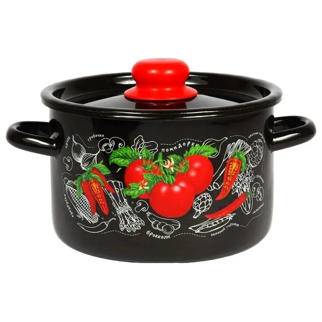 Кастрюля эмалированная 2,9л черная с рисунком "Помидорки", сталь, для плит