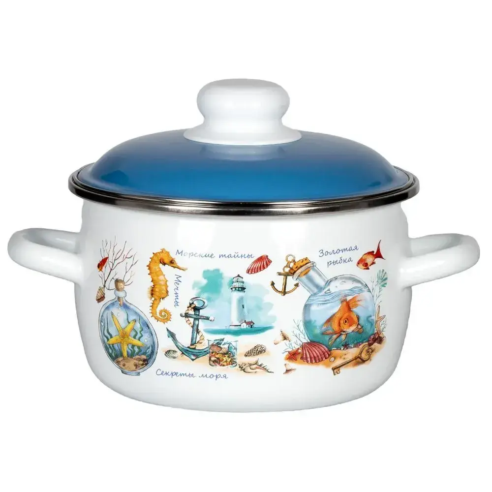 Белая основа с синей крышкой дополнена авторскими рисунками: морская звезда, рыбка в банке и тематические надписи «Морские тайны». Продукция российского производителя «СтальЭмаль» соответствует требованиям ГОСТ и поставляется с официальной декларацией соответствия.