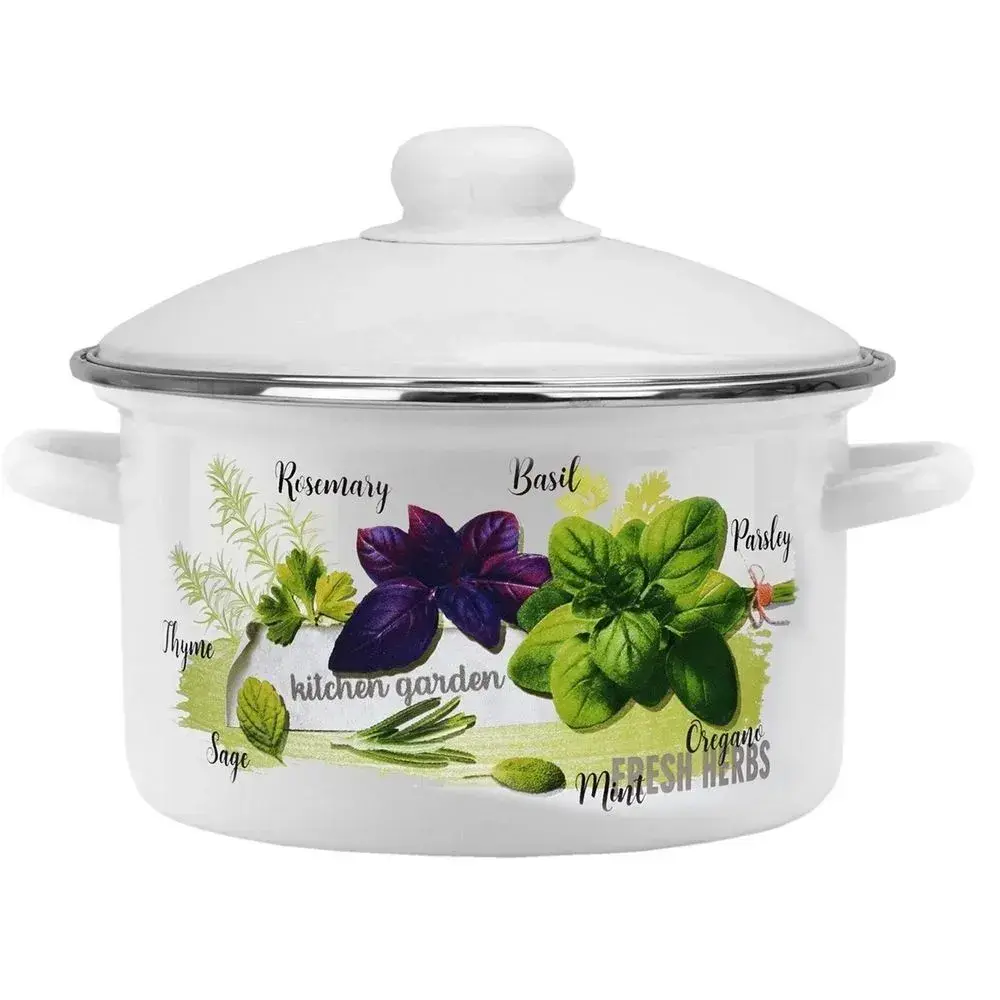 Кастрюля эмалированная «Базилик» 3л с крышкой, дизайн свежих трав, металлические ручки