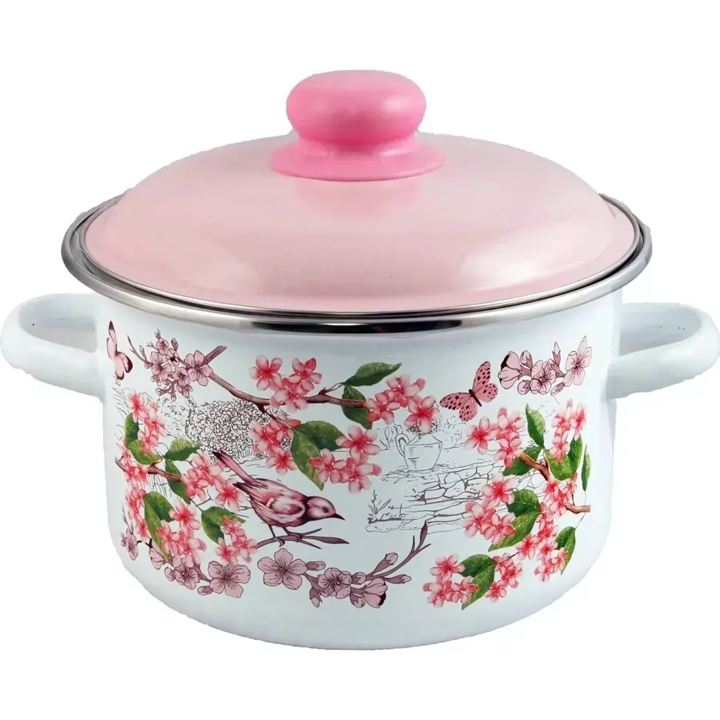 Кастрюля эмалированная "Bird" 5,5л с декором птиц и цветов, белая, розовая крышка, металл