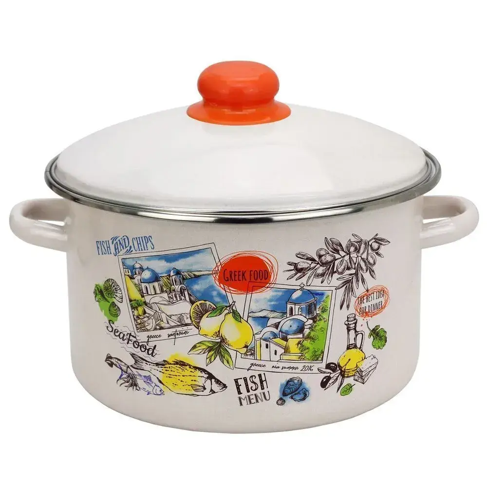 Кастрюля эмалированная «Греческая кухня» 2л с крышкой, металл, декор рыбы/оливки, цвет в ассортименте