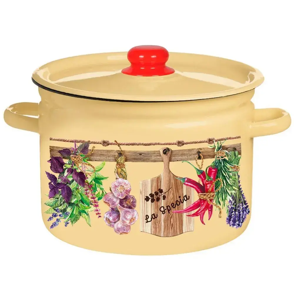 Преимущества: превосходное качество материалов, экологичность, стойкость к коррозии и легкость в уходе. Визуально привлекательный дизайн с декоративным рисунком трав и перцев дополнит интерьер кухни. Комфортные ручки позволяют удобно переносить кастрюлю, а яркая крышка с ручкой легко фиксируется при готовке.