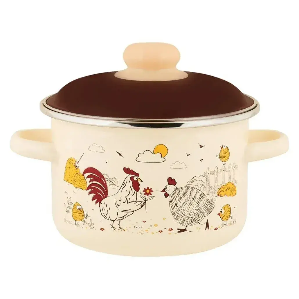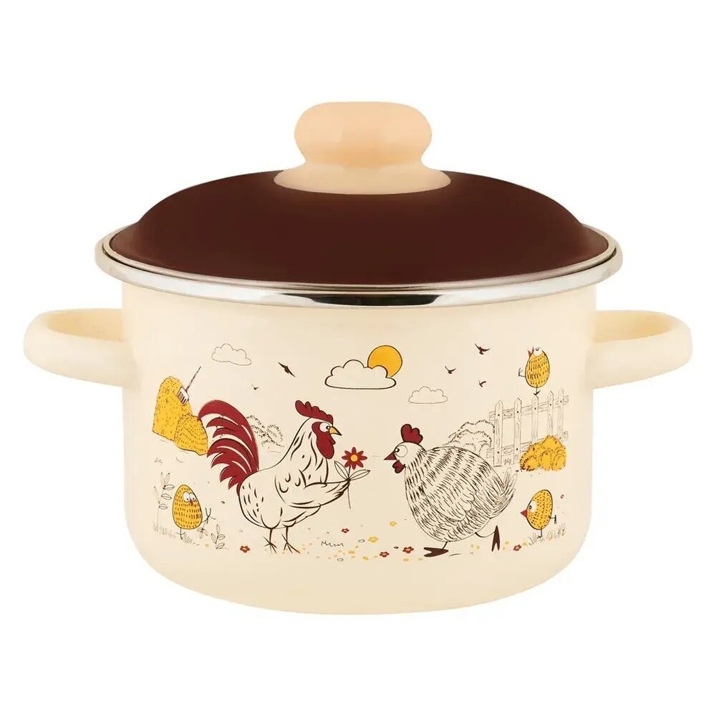 Кастрюля эмалированная "Подворье" 2л, кремовая с коричневой крышкой и рисунком