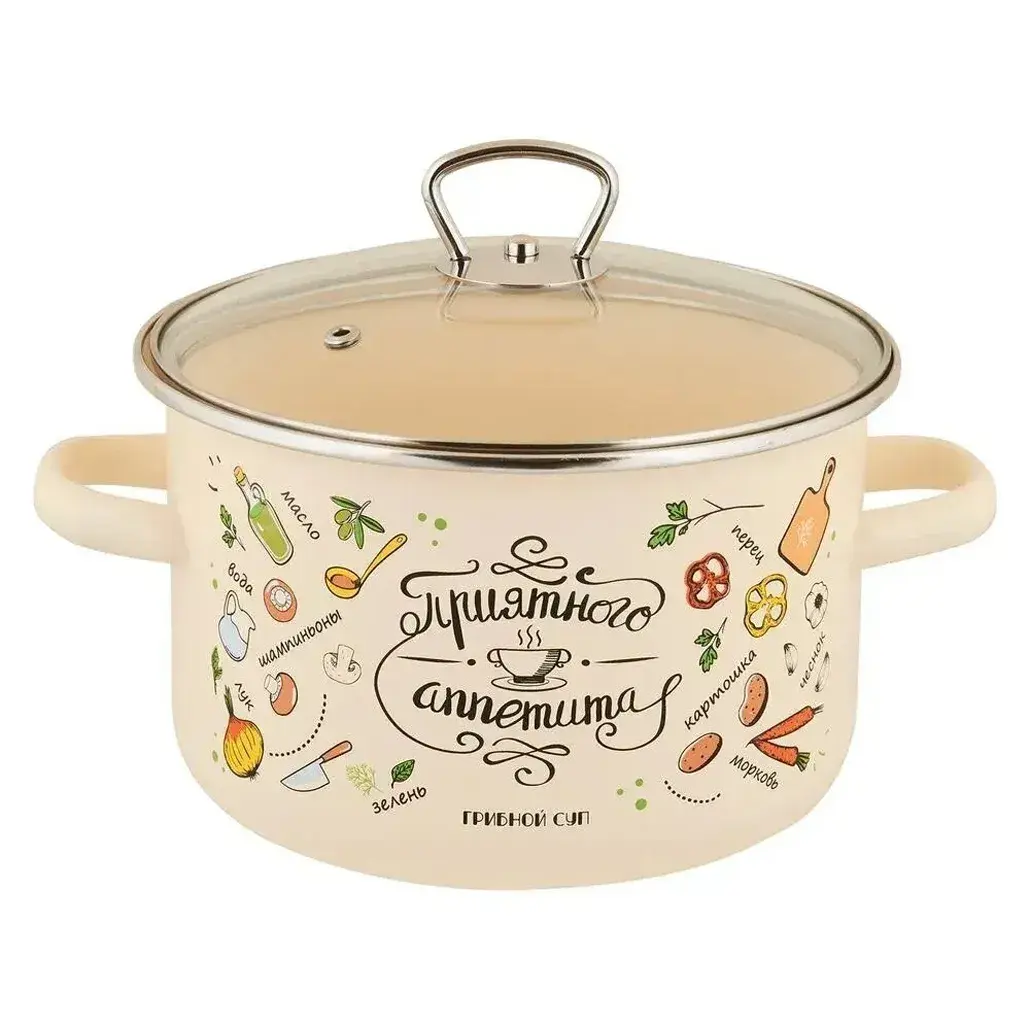 Кастрюля эмалированная «Приятного аппетита» 4л, светло-кремовая, с крышкой и ручками