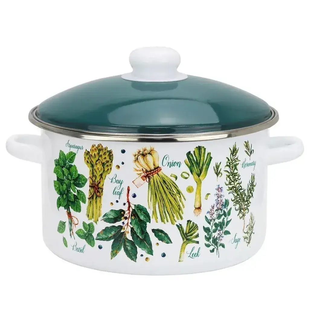 Эта кастрюля объемом 4 литра идеально подходит для приготовления различных блюд. Сделана из высококачественной эмалированной стали, что обеспечивает долговечность и стойкость к коррозии. Кастрюля украшена яркими и реалистичными изображениями зелёных трав и растений, создающими уют и вдохновляющую атмосферу в вашей кухне. Благодаря удобным ручкам и крышке с ручкой-бугром, процесс готовки становится безопасным и комфортным.