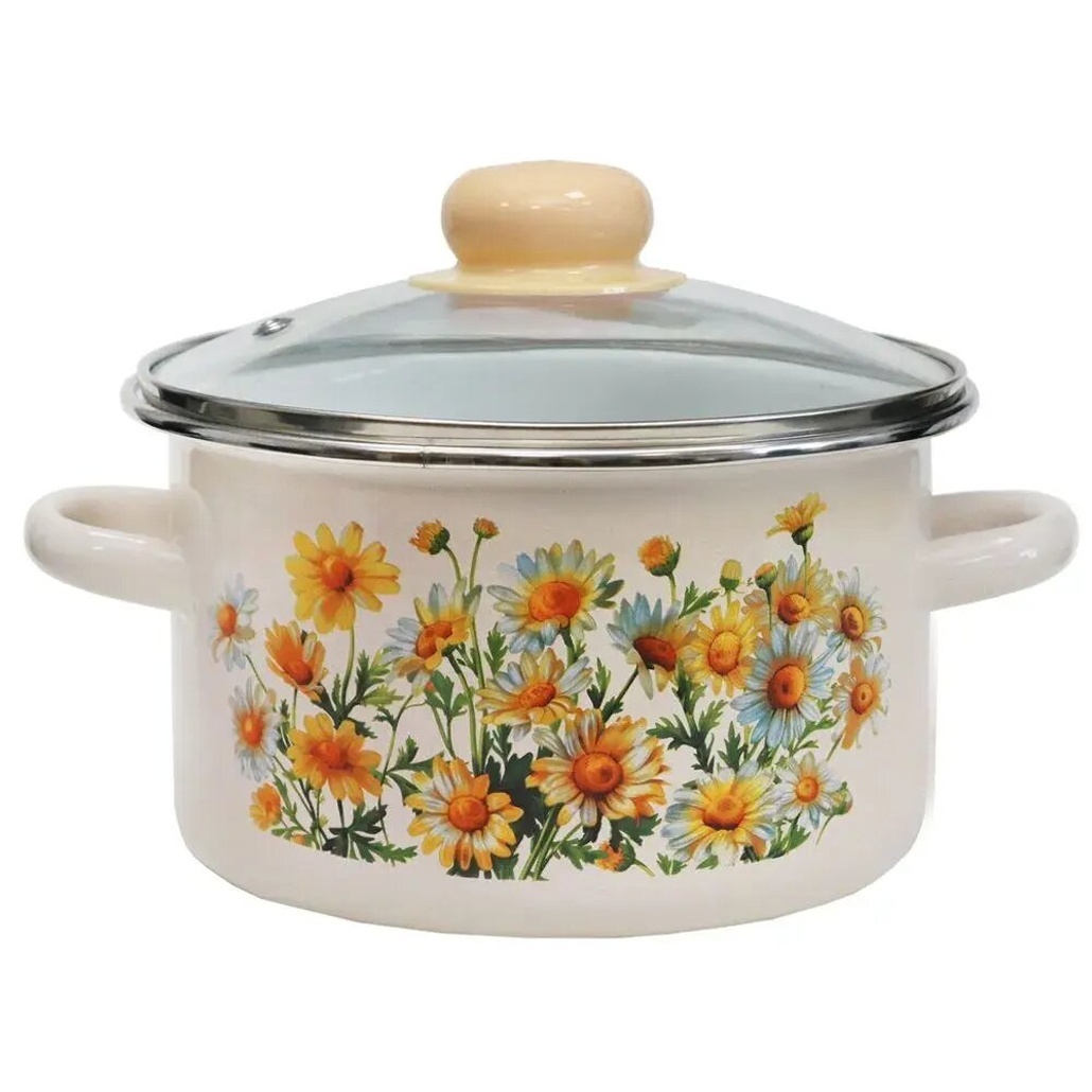 Кастрюля эмалированная «Ромашки» 3 л с цветочным декором, стеклянная крышка, металлический ободок