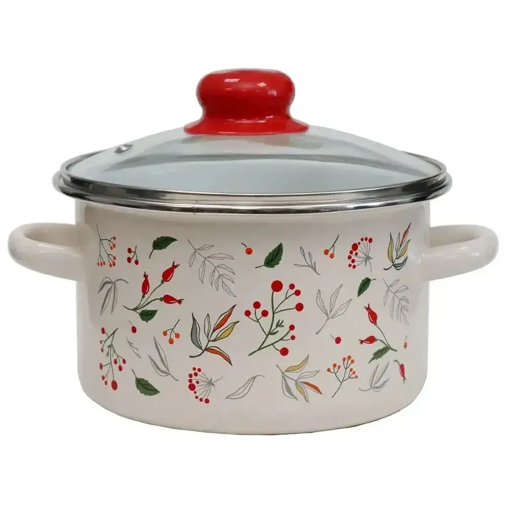 Эмалированная кастрюля объёмом 2 литра сочетает практичность и уютный декор с ягодными мотивами. Идеальна для приготовления супов, каш и тушения овощей — сохраняет тепло и подходит для всех типов плит.