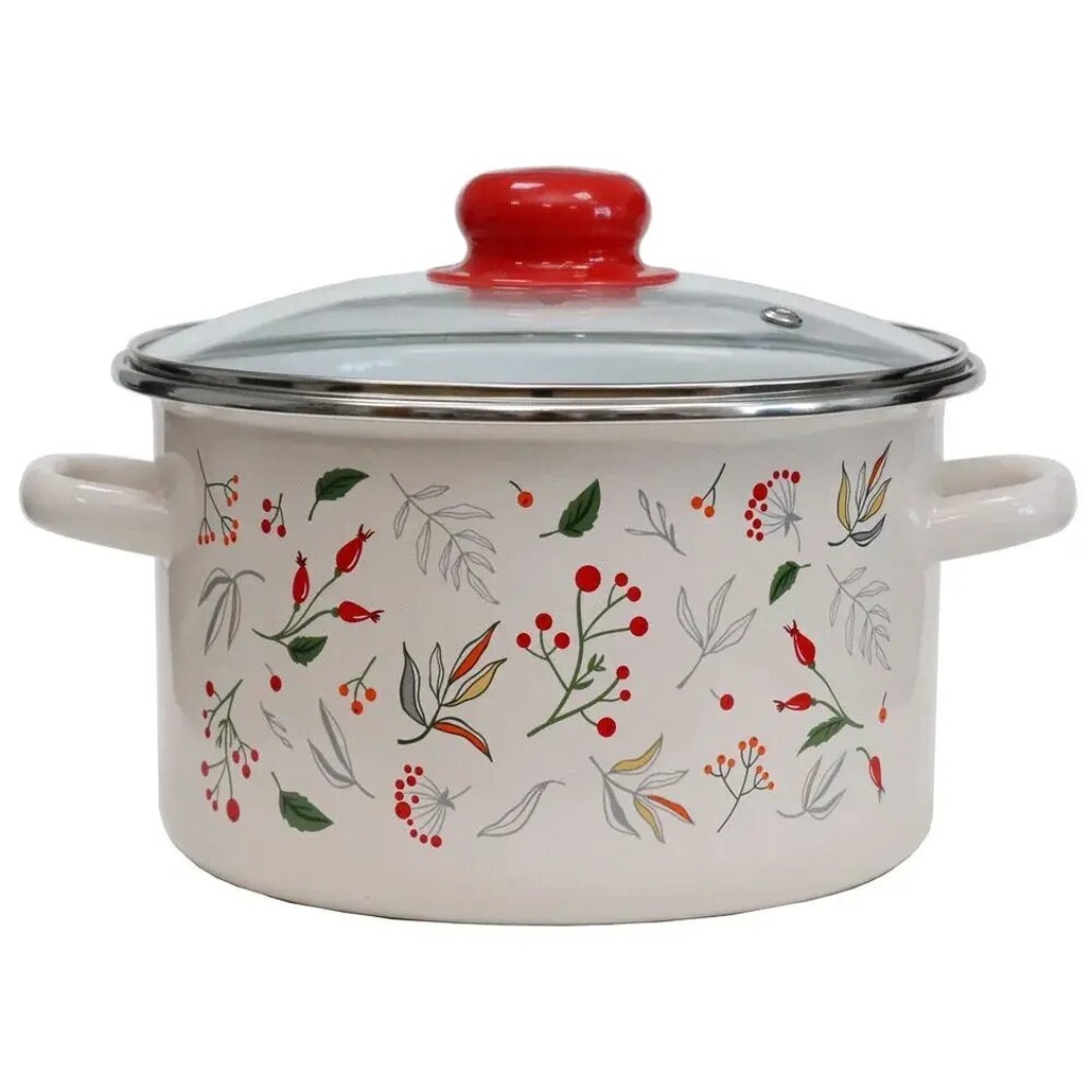 Кастрюля эмалированная «Ягодки» 3л со стеклянной крышкой, металлическая ручка