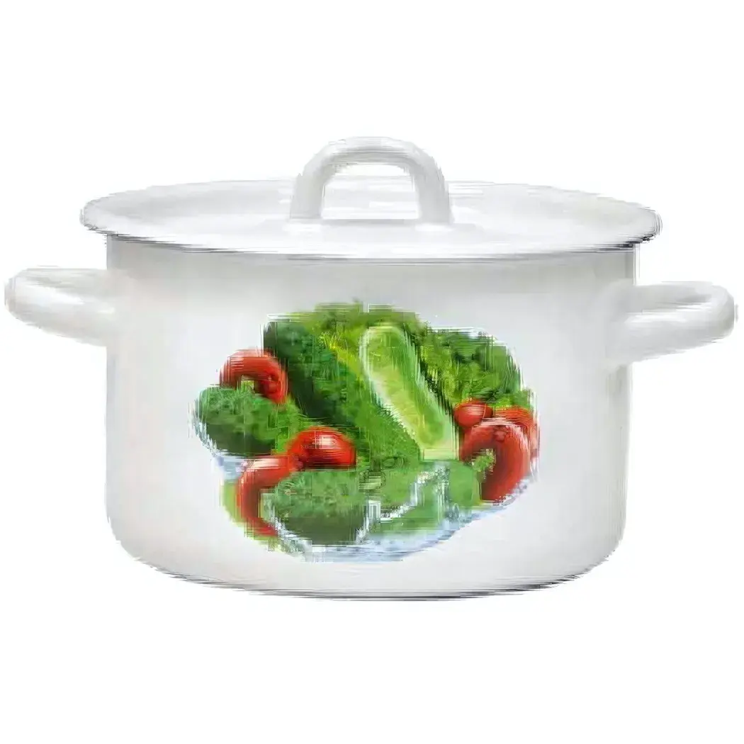 Кастрюля эмалированная 2л, с рисунком овощей, без ободка, белая