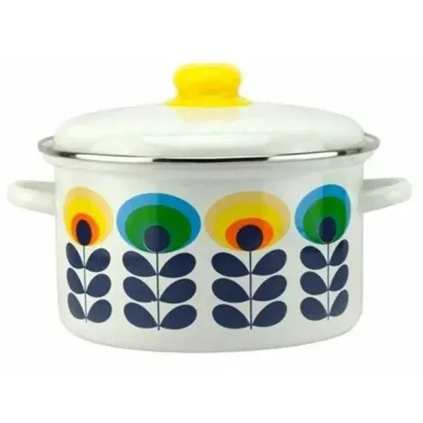 Кастрюля выполнена в белом цвете с декоративным узором, который включает синие, жёлтые, оранжевые и зелёные цвета. Крышка кастрюли имеет жёлтую ручку и металлический ободок, что добавляет ей современный вид. Размеры кастрюли делают ее идеальной для небольших семей или для приготовления порционных блюд.