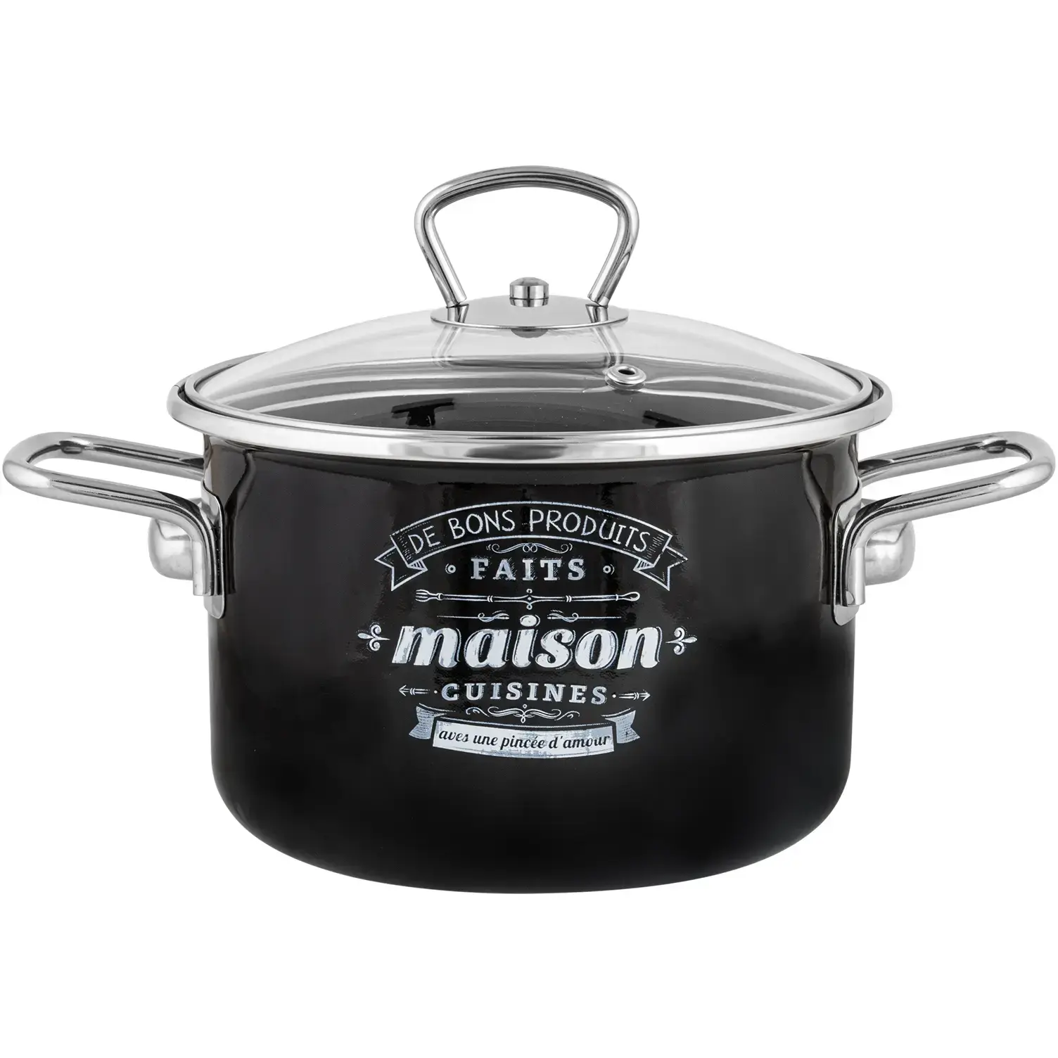 Эмалированная сталь, из которой изготовлена кастрюля, гарантирует долговечность и легкость в уходе. Гладкая поверхность предотвращает прилипание пищи, а стильный черный цвет с французскими надписями добавляет изысканности. Кастрюля подходит для всех типов плит, включая индукционные, что делает ее универсальным решением для любой кухни.