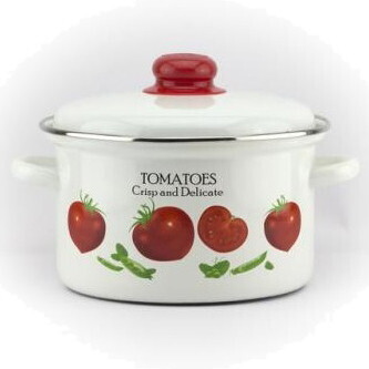 Кастрюля выполнена в белом цвете с декором, который включает изображения зрелых томатов и листьев. Размеры кастрюли позволяют готовить достаточно порций для всей семьи, а её стильный внешний вид делает её не только функциональным, но и эстетически привлекательным элементом вашей кухни.
