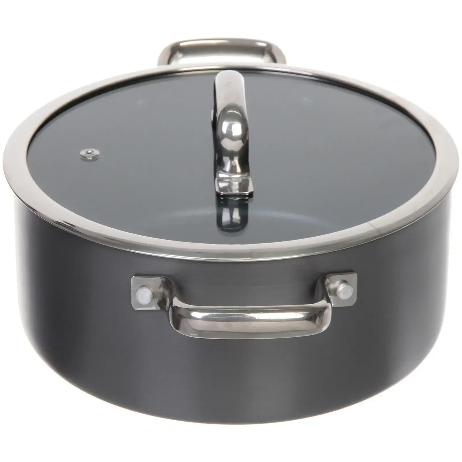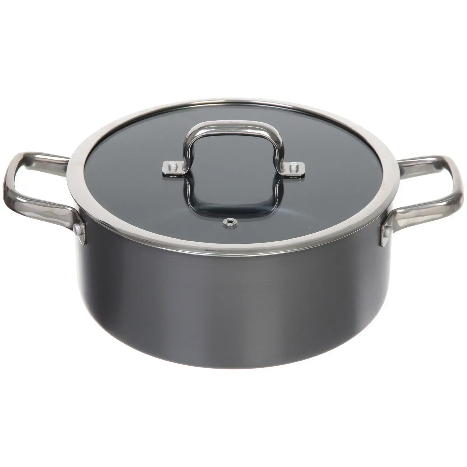 Кастрюля выполнена из алюминия, что обеспечивает отличную теплопроводность и равномерное прогревание пищи. Размер кастрюли составляет 4,4 л, что идеально подходит для приготовления блюд на семью или для гостей. Стеклянная крышка с металлическим ободком и ручкой в центре добавляет стильный акцент и функциональность. Кастрюля имеет гладкую матовую поверхность темно-серого цвета, что делает её привлекательной и современной.