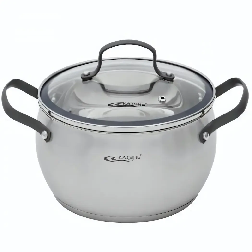 Кастрюля имеет два удобных боковых ручки, выполненные из черного пластика, что обеспечивает комфортное использование. Размеры кастрюли идеально подходят для приготовления пищи на небольших и средних порциях. Логотип производителя «Катунь» на поверхности кастрюли подчеркивает ее качество и надежность.