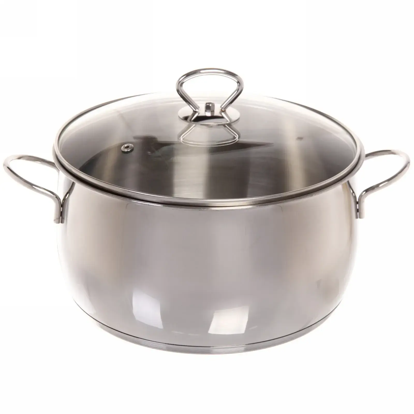 Кастрюля имеет округлую форму с двумя удобными ручками, что облегчает ее переноску. Блестящая поверхность придает ей элегантный вид, а стеклянная крышка с металлическим ободком добавляет стильности. Размер кастрюли позволяет готовить большие порции, что особенно удобно для семейных обедов или праздников.