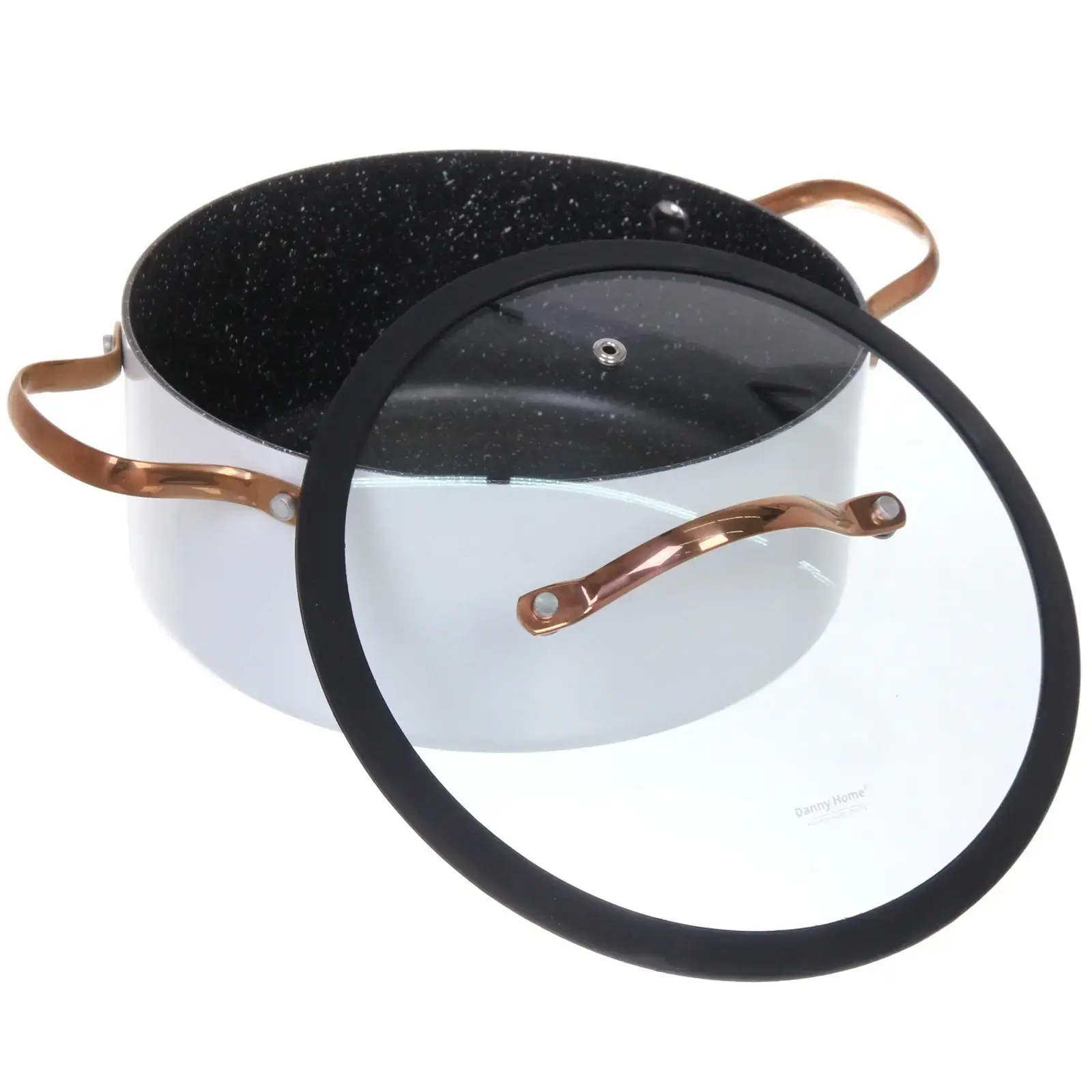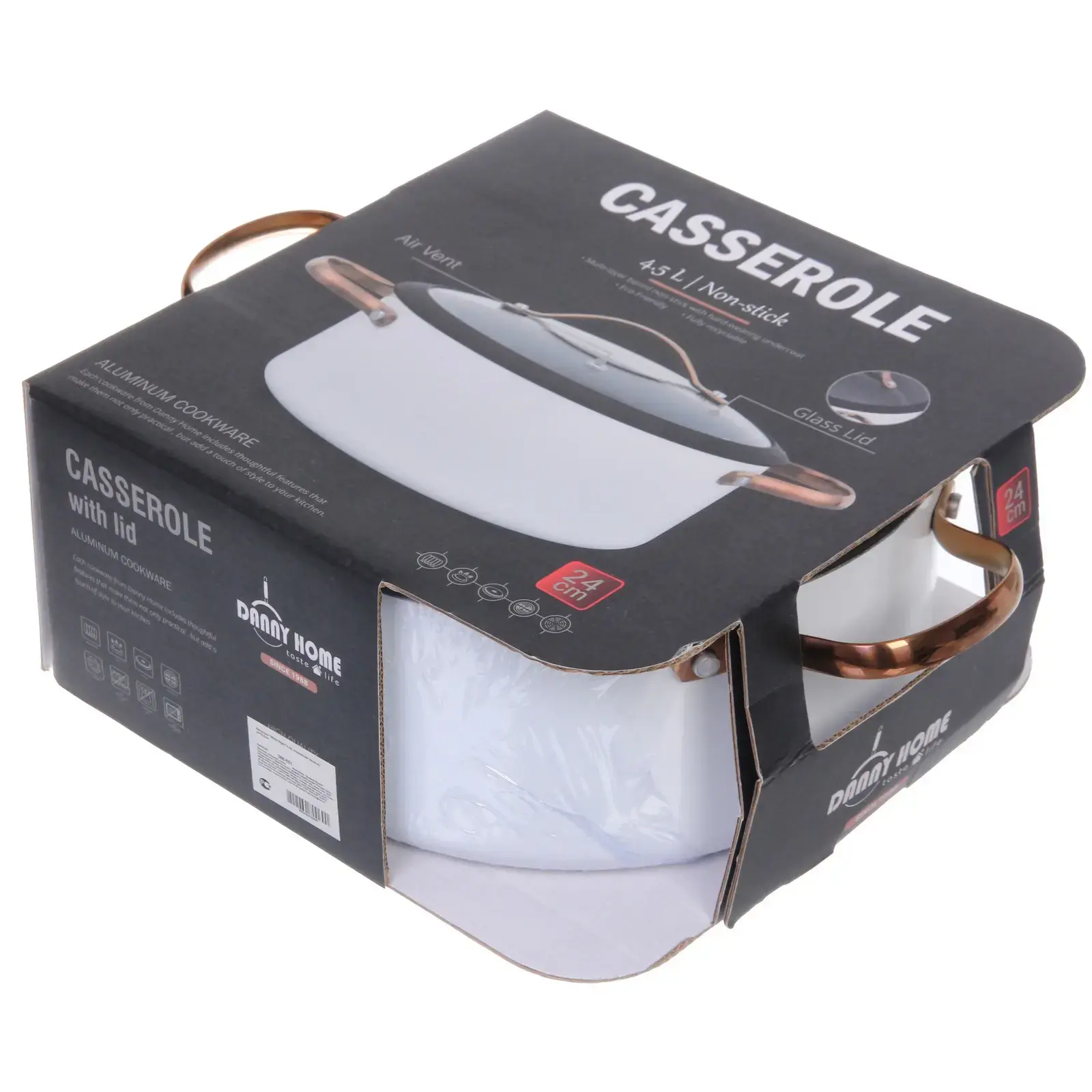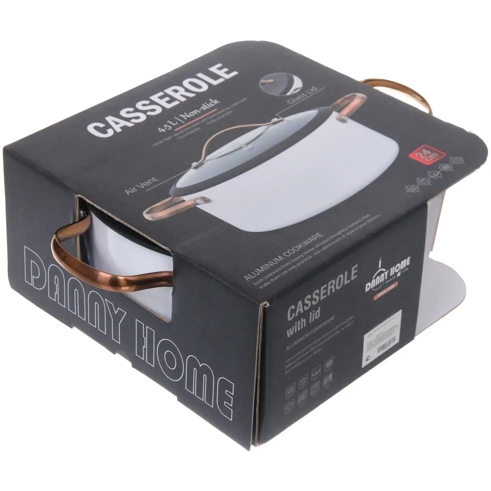 Размер кастрюли составляет 24 см в диаметре и 10,5 см в высоту. Она выполнена из качественного алюминия и оснащена стеклянной крышкой с вентиляционным отверстием, что предотвращает образование избыточного пара. Ручки кастрюли имеют медный цвет, что придаёт ей стильный и современный вид.