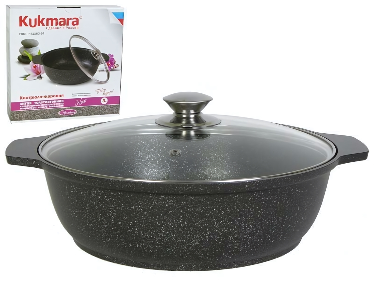 Приготовление еды станет комфортным и быстрым с кастрюлей-жаровней Kukmara. Благодаря объему в 3 литра она подходит для повседневного использования и приготовления блюд для всей семьи.