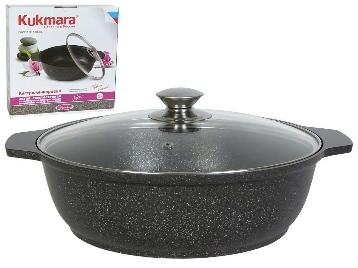 Кастрюля-жаровня Kukmara 3л, черная, алюминий литой, со стеклянной крышкой