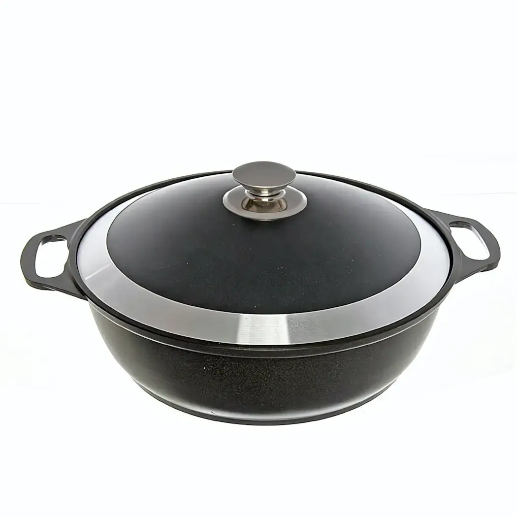 Эта кастрюля-жаровня объемом 3 литра изготовлена из литого алюминия и обладает высококачественным антипригарным покрытием, что делает процесс приготовления пищи не только удобным, но и приятным. Благодаря значительной толщине стенок и дна, кастрюля гарантирует долговечность и надежность в использовании, а также исключает деформацию корпуса.
