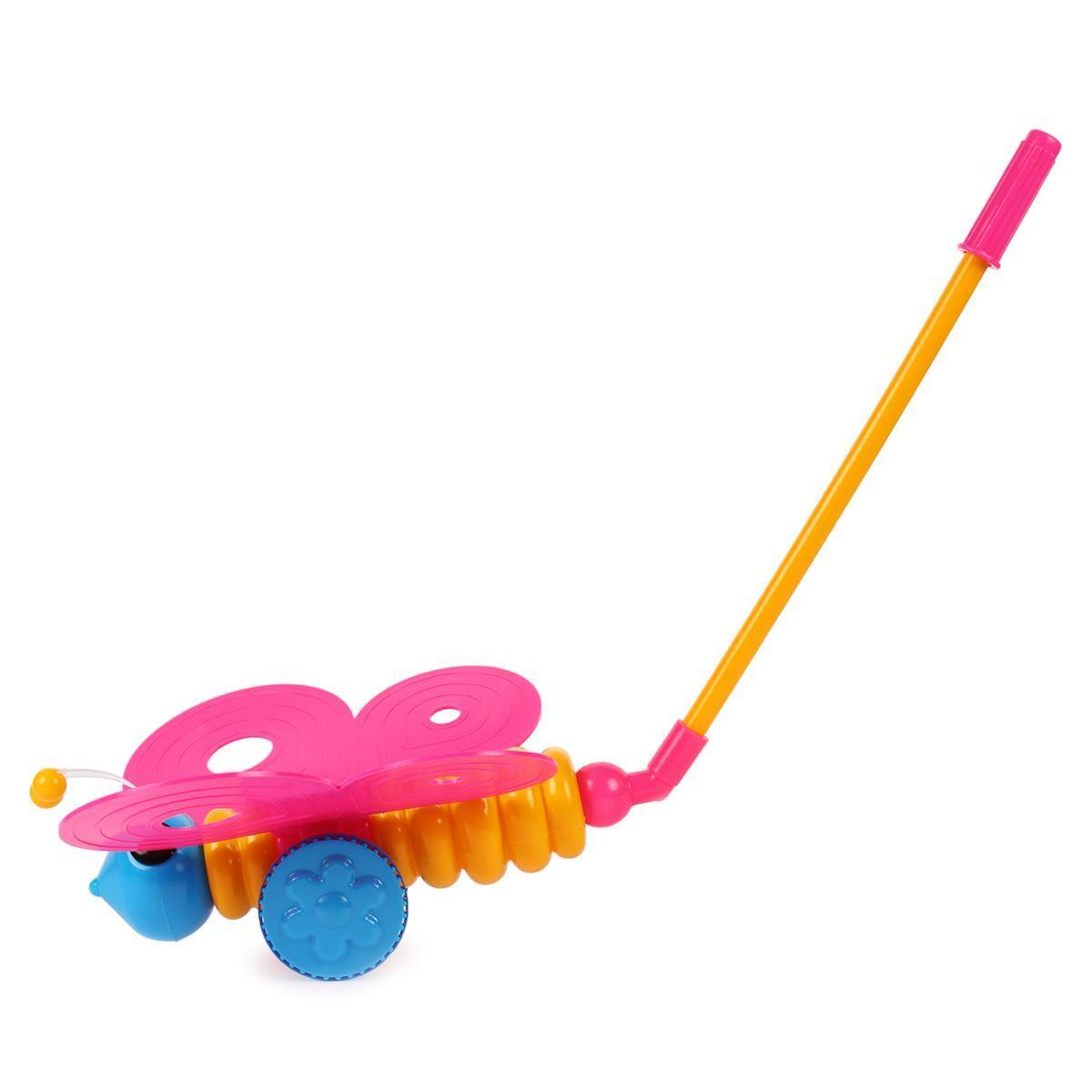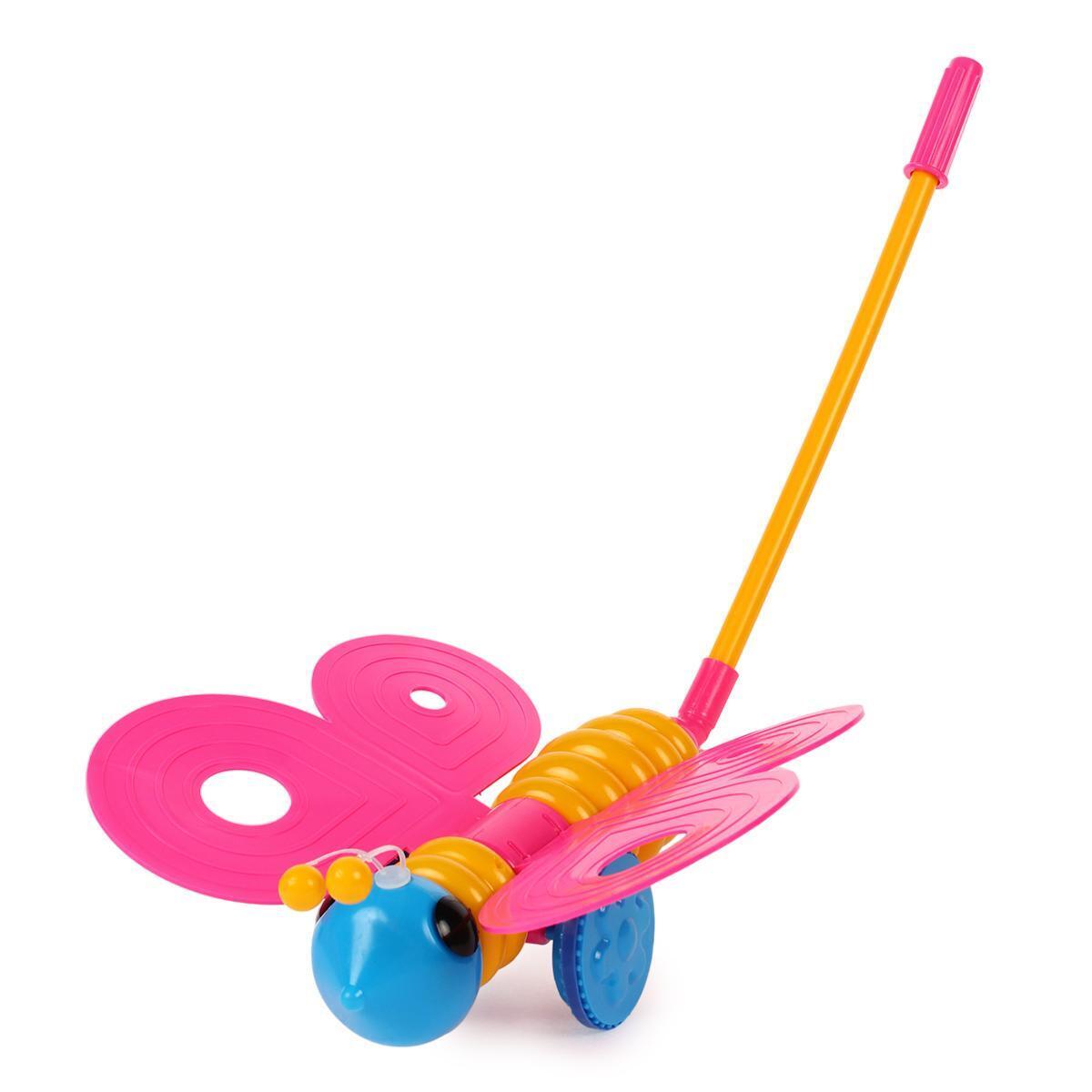 Каталка детская развивающая «Бабочка», пластик, розовый/голубой/оранжевый, с подвижными крыльями и ручкой