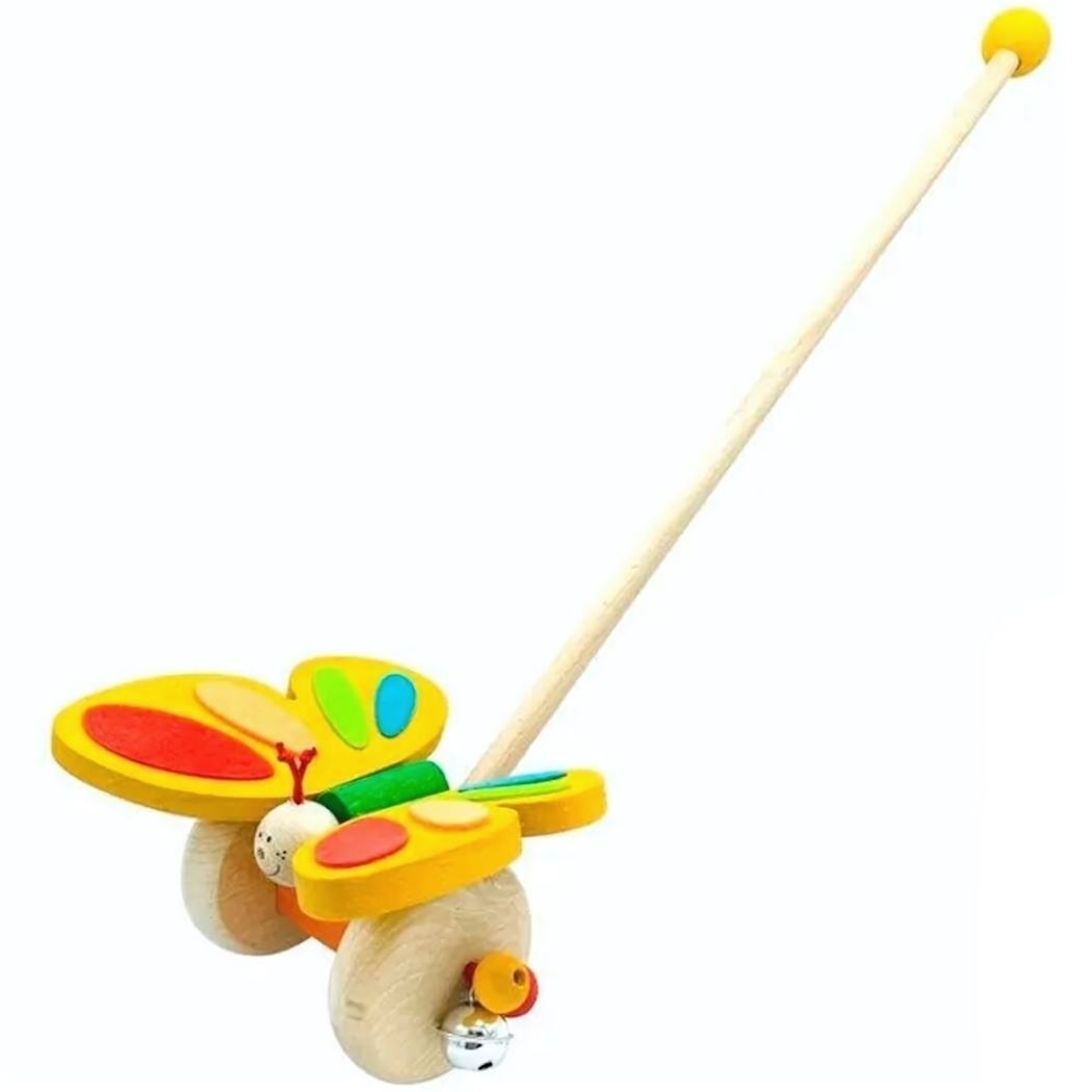 Каталка выполнена из массива ясеня, бука и берёзы. Длина ручки — 50см. Яркая деревянная бабочка, два надёжных колеса, компактная конструкция без острых углов. Идеально подходит для раннего физического и творческого развития малыша, внесёт радость в каждый день.