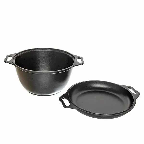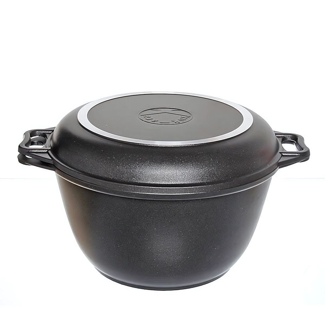 Казан идеально подходит для приготовления различных блюд: от супов до жаркого. Он оснащен практичной крышкой-сковородой, что делает его универсальным инструментом на вашей кухне. Две удобные ручки по бокам обеспечивают легкость в обращении, а толстостенные стенки гарантируют долговечность и устойчивость к деформациям.