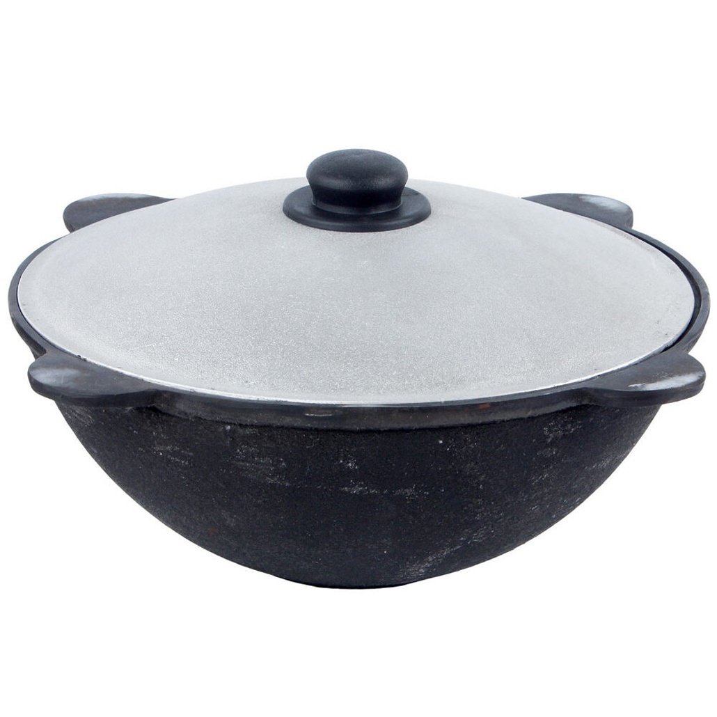 Казан имеет объем 4,5 литра, что позволяет готовить большие порции. Алюминиевая крышка легка и удобна в использовании, а чугунный корпус обеспечивает отличные кулинарные результаты. Размеры казана делают его подходящим для использования на всех типах плит, включая газовые и электрические.
