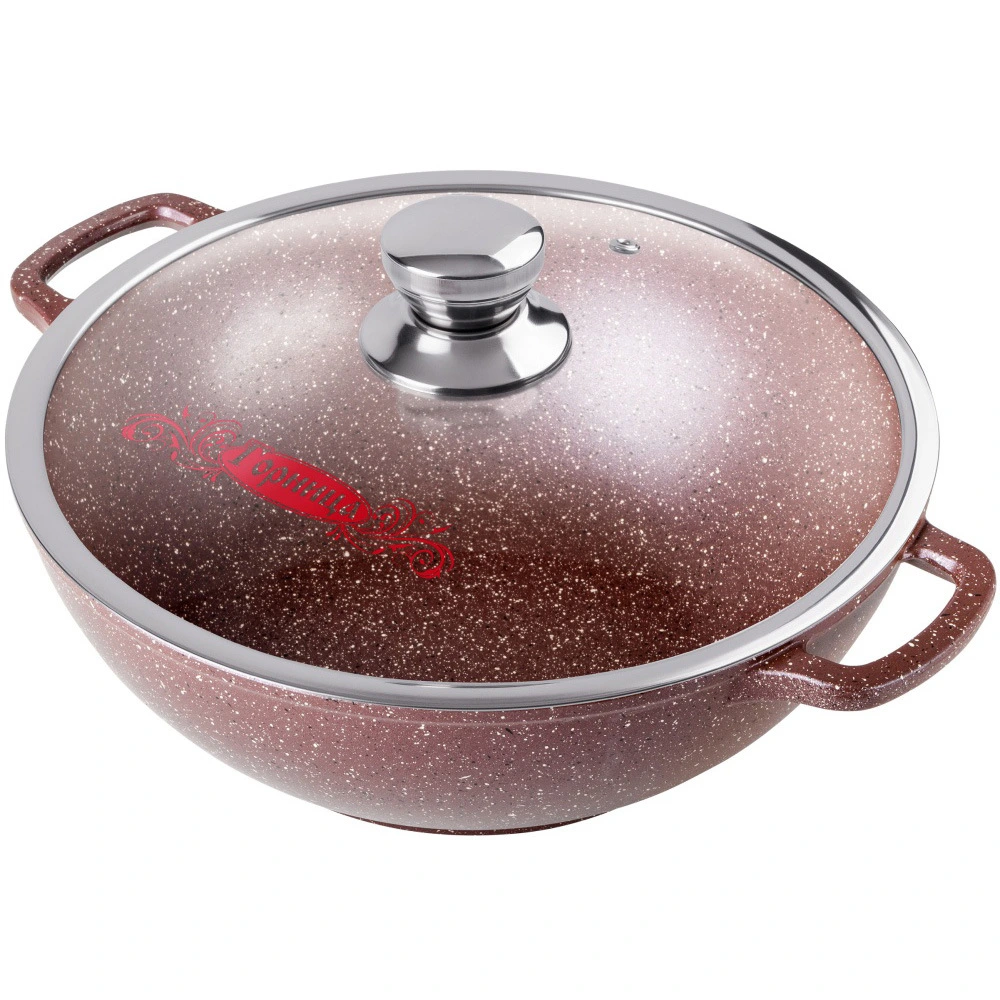 - Прочная конструкция: Казан выполнен из литого алюминия, что обеспечивает равномерный нагрев и долговечность. Две литые боковые ручки обеспечивают надёжный и безопасный захват даже в кулинарных рукавицах.