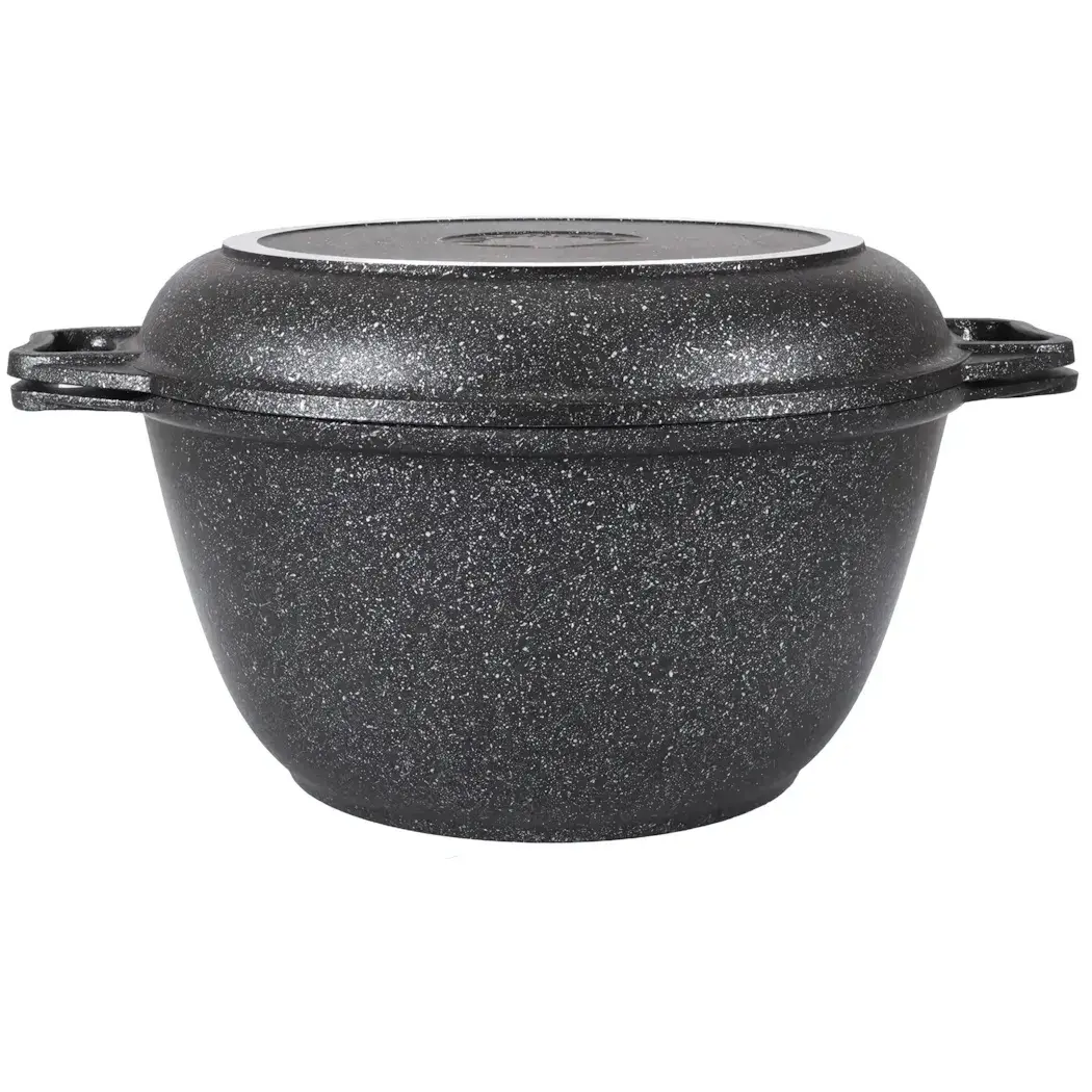 Казан подходит для использования в духовом шкафу благодаря цельнолитым ручкам, что делает его еще более универсальным. Алюминиевая крышка-сковорода с антипригарным покрытием с обеих сторон позволяет не только накрывать казан, но и использовать ее для жарки и пассерования. Это делает казан идеальным для приготовления различных блюд, от овощей до мяса.