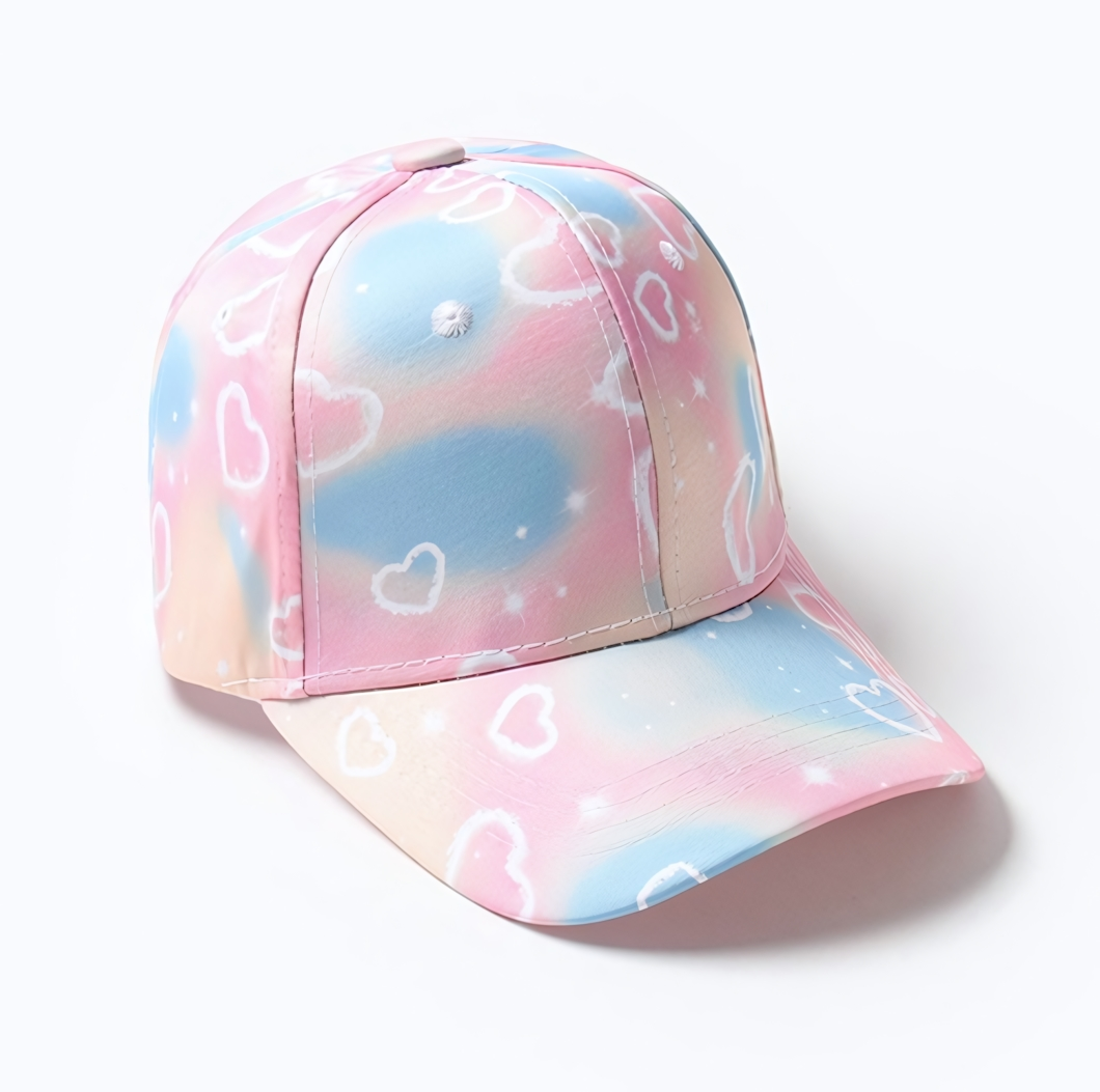 Нежный градиент от розового к голубому гармонично сочетается с одеждой в пастельных тонах. Облака и сердечки на передней части создают позитивное настроение, а широкий козырек надежно защищает от солнца.