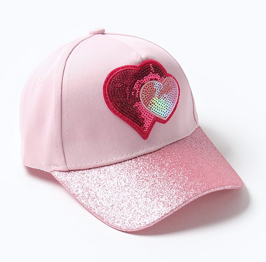 Нежные сердечки из качественной аппликационной ткани создают праздничное настроение. Переливающиеся пайетки на центральном элементе привлекают внимание, делая кепку заметным акцентом в образе. Контрастная блестящая окантовка козырька добавляет изделию стильную завершённость.