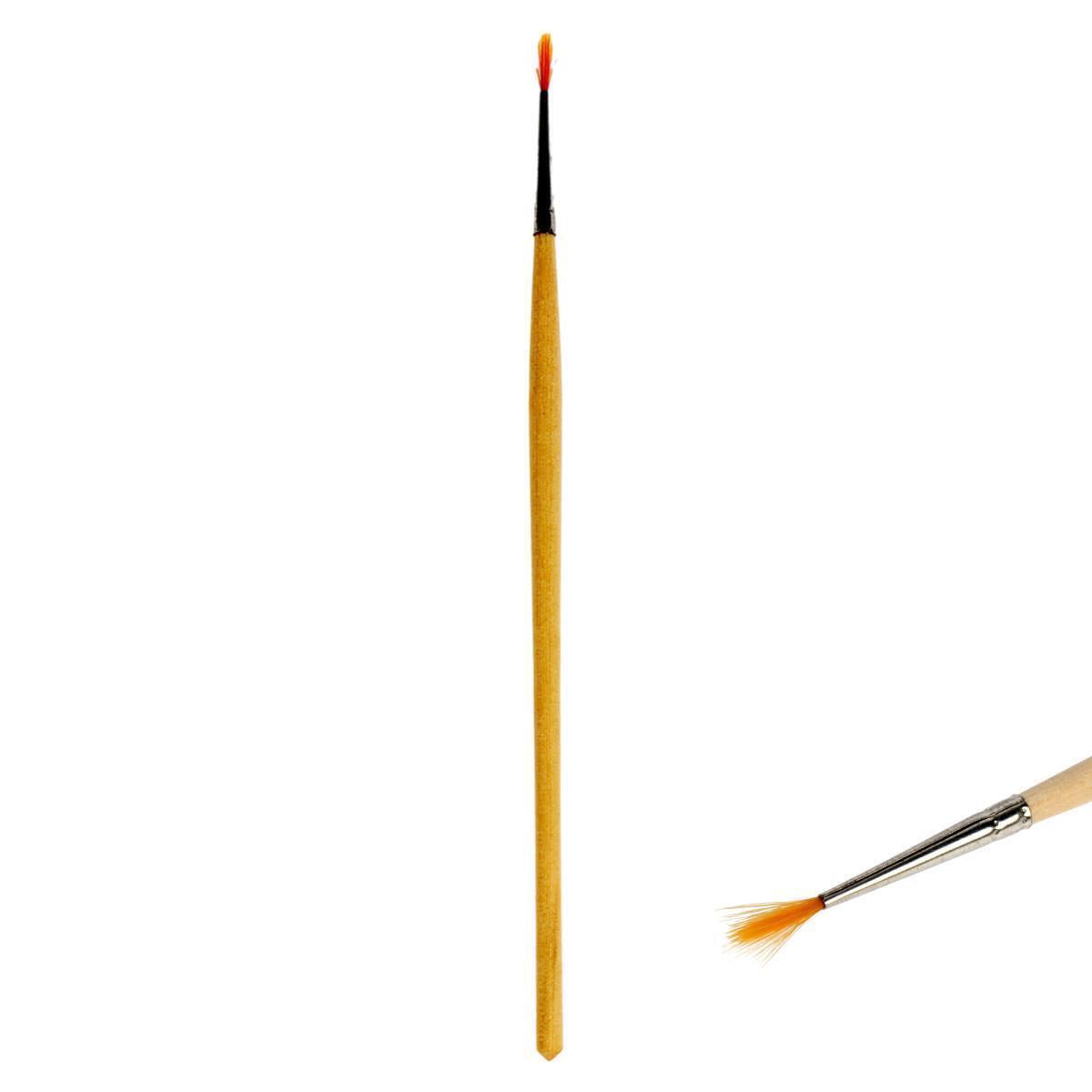 Кисть имеет длину ручки около 15-20 см и выполнена из качественных материалов. Щетинки имеют закругленную форму, что делает их идеальными для точной работы. Цвет ручки светло-коричневый, а щетинки окрашены в оранжевый и черный цвета, что придает кисти стильный вид.