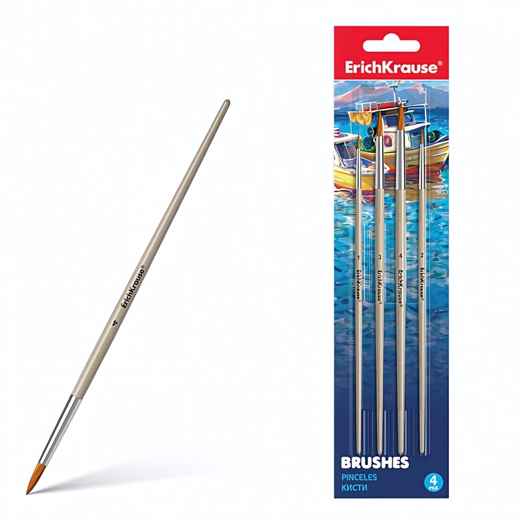 Кисти ErichKrause 4шт., синтетика, для акварели и гуаши, упругие, долговечные