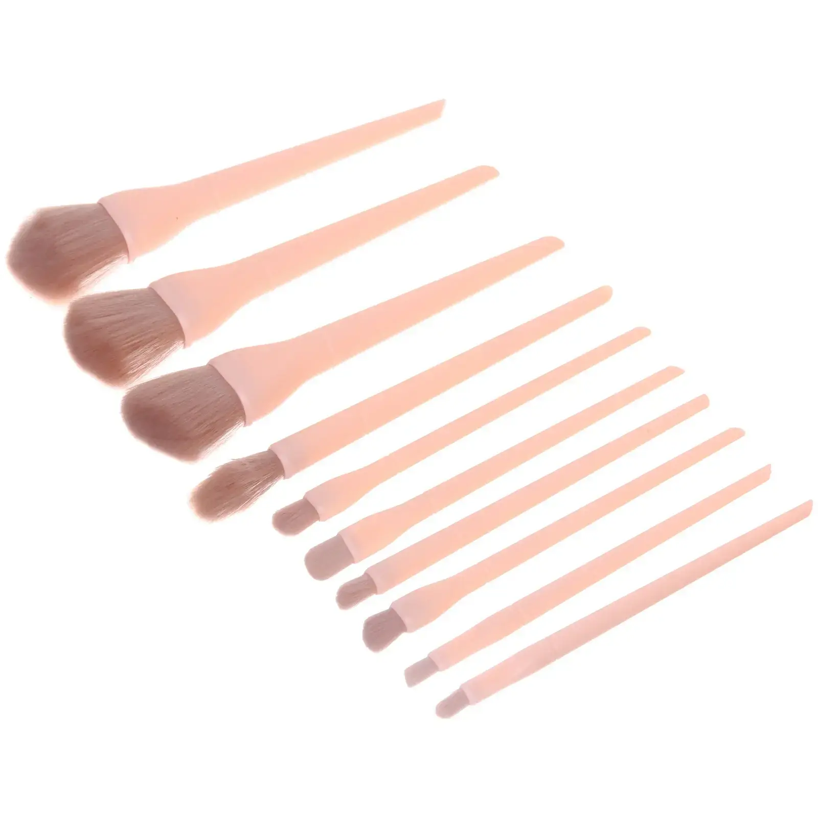 - В наборе десять кистей разной формы и плотности — для пудры, теней, коррекции и растушёвки.