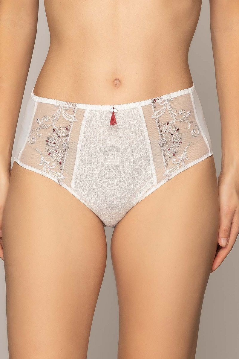 Передняя часть выполнена из комбинации гладкой ткани и полупрозрачной сетки с аккуратной вышивкой. Декоративный элемент по центру пояса добавляет утончённости, а фестончатый край подчеркивает женственность модели. Задняя часть из гладкого материала обеспечивает комфортную посадку без лишнего объёма под одеждой.