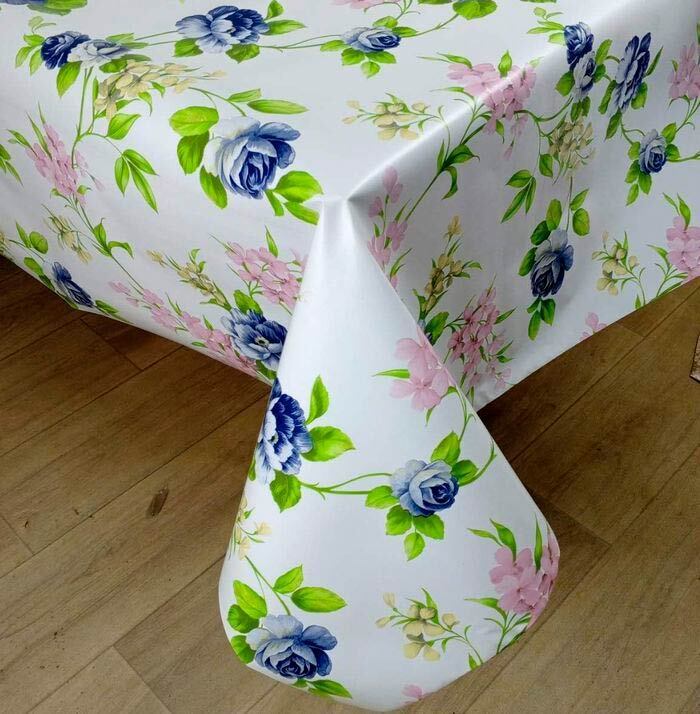 Ширина клеенки составляет 140 см, что позволяет накрыть столы разных форм и размеров. Материал обеспечивает прочность и износостойкость изделия, а яркий цветовой орнамент с синими, голубыми и розовыми цветами добавляет эстетическую ценность. Поверхность устойчива к загрязнениям, а край можно легко подрезать под нужные размеры.