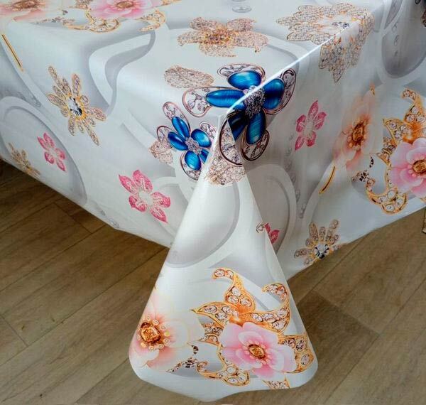Цвет фона — светлый (белый или светло-серый), позволяет легко вписать клеенку в любой интерьер. Рисунок выполнен в оттенках розового, оранжевого, золотистого и синего, местами с блеском, создающим эффект ювелирного украшения. Отгружается одна клеенка, цвет и рисунок соответствуют изображению.