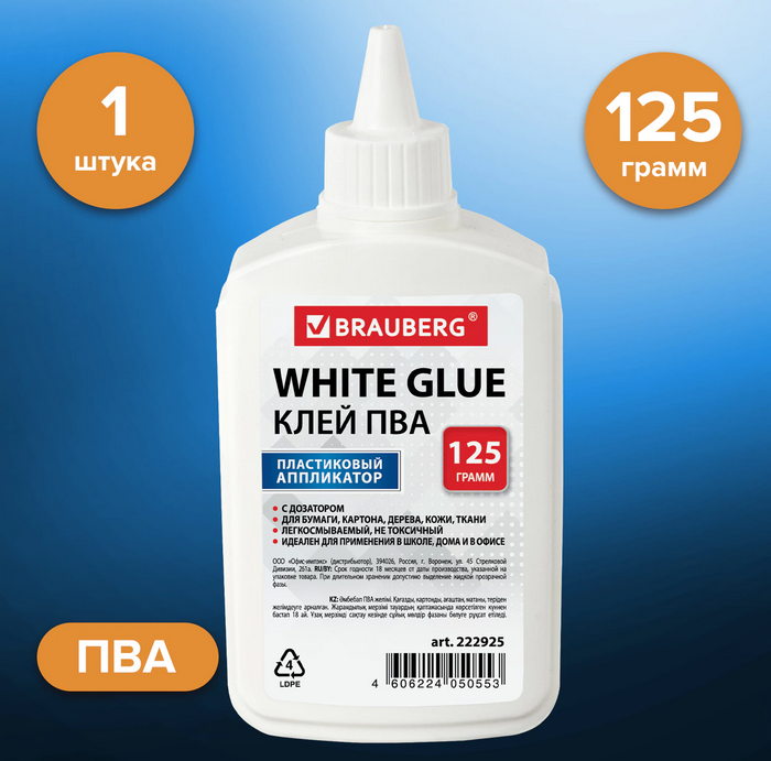 Клей ПВА 125г. бумага, картон, дерево (BRAUBERG)