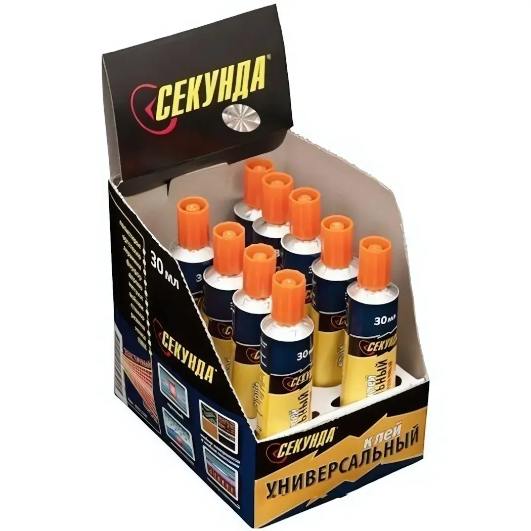 Каждый тюбик содержит 30 мл клея, что является стандартным объемом для подобных продуктов. Упаковка выполнена в ярком дизайне с логотипом 'Секунда', что делает ее заметной на полке. Не упустите возможность сделать свои проекты более качественными и удобными с помощью универсального клея 'Секунда'!