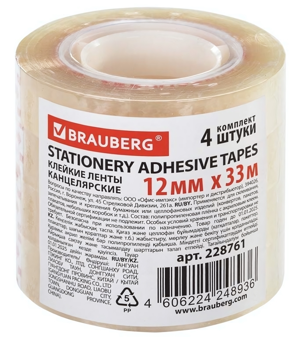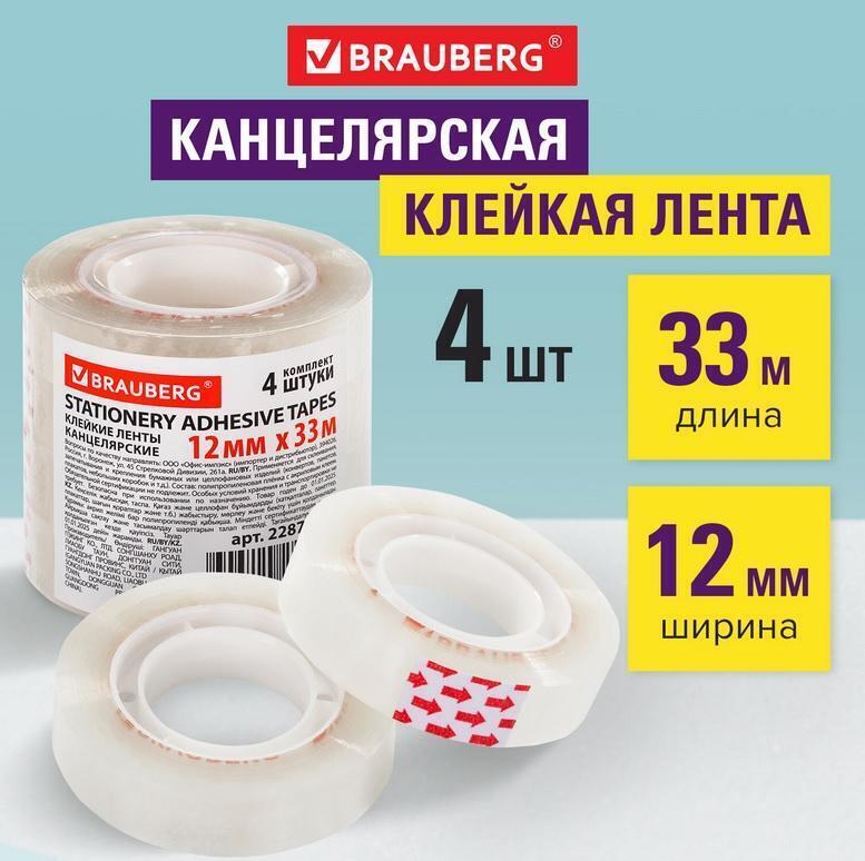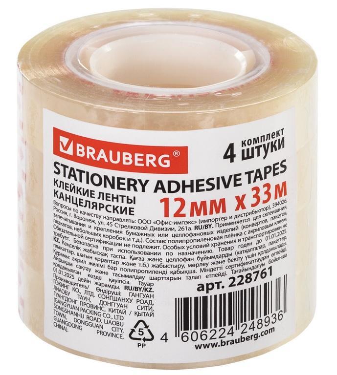 Скотч канцелярский прозрачный 'BRAUBERG', ширина 12мм, длина 33м / комплект 4шт.