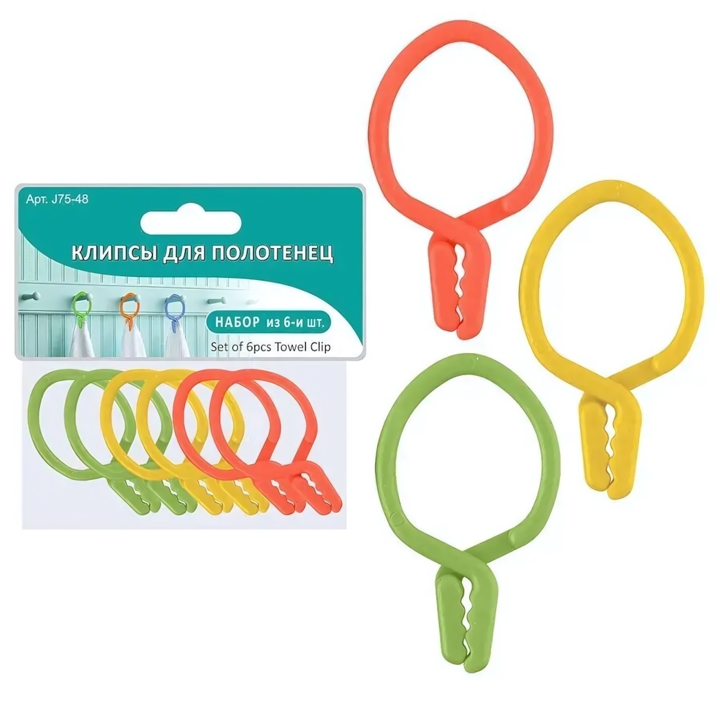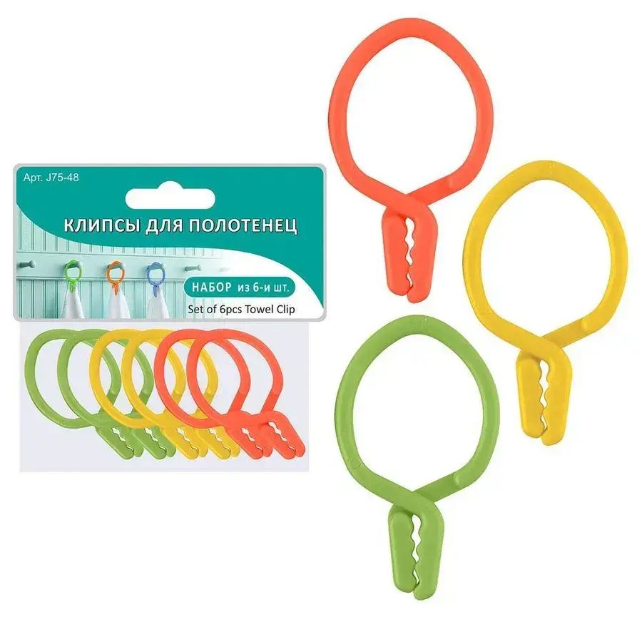 Набор из 6 прочных клипс для аккуратного хранения полотенец и текстиля. Удобное решение для фиксации на трубах, рейлингах и крючках диаметром до 4 см.
