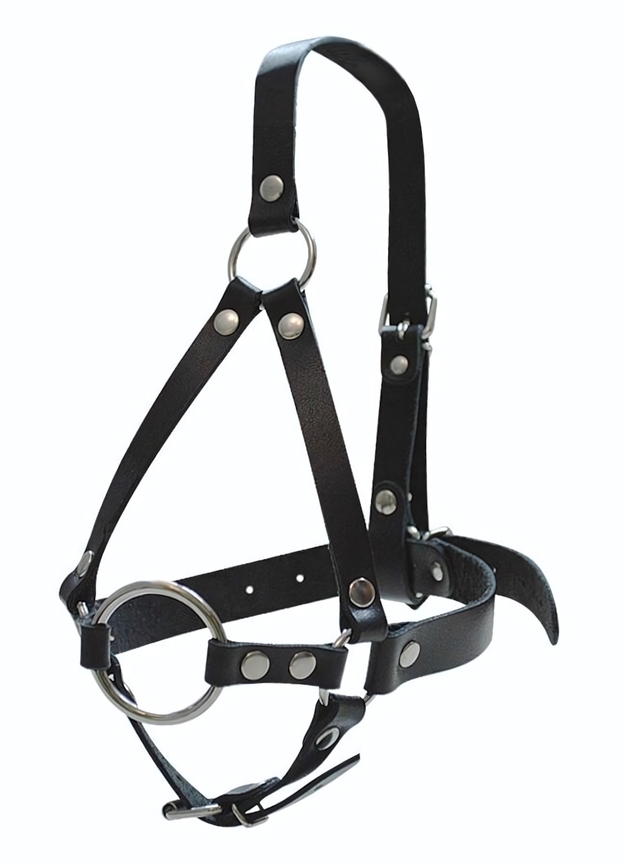 Кляп-рамка со сбруей из натуральной кожи, черный цвет, регулируемые ремни, металлические кольца