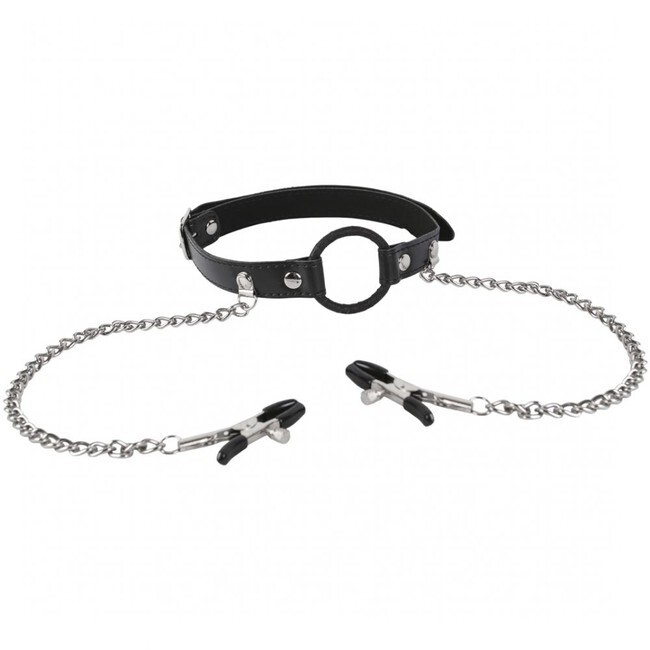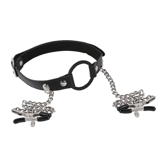 Кляп с зажимами для сосков, черный, эко-кожа/металл, длина 59см