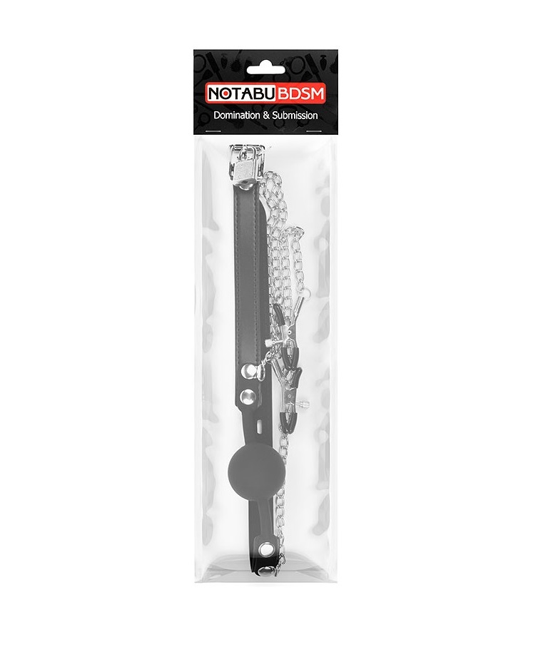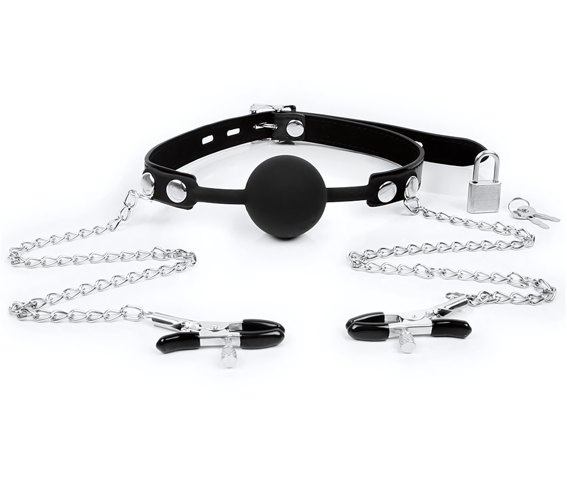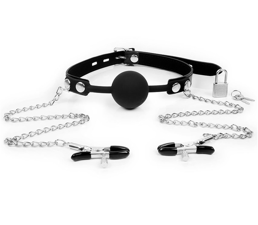 Модель сочетает кляп с шариком диаметром 3,5 см и металлические зажимы для сосков, соединенные прочными цепочками. Регулируемый ремешок позволяет комфортно зафиксировать кляп, подстраивая посадку под индивидуальные особенности. Зажимы оснащены винтовым механизмом — вы сами контролируете силу сжатия, постепенно усиливая ощущения.