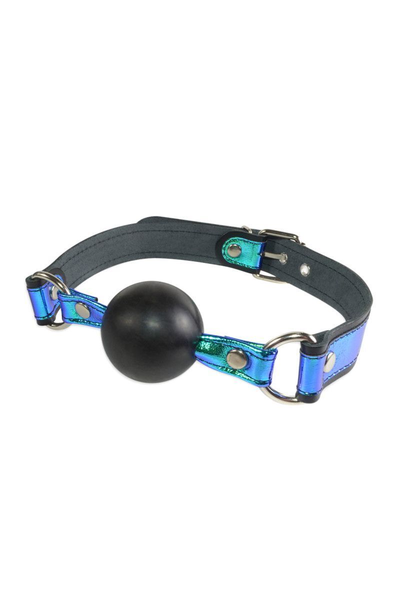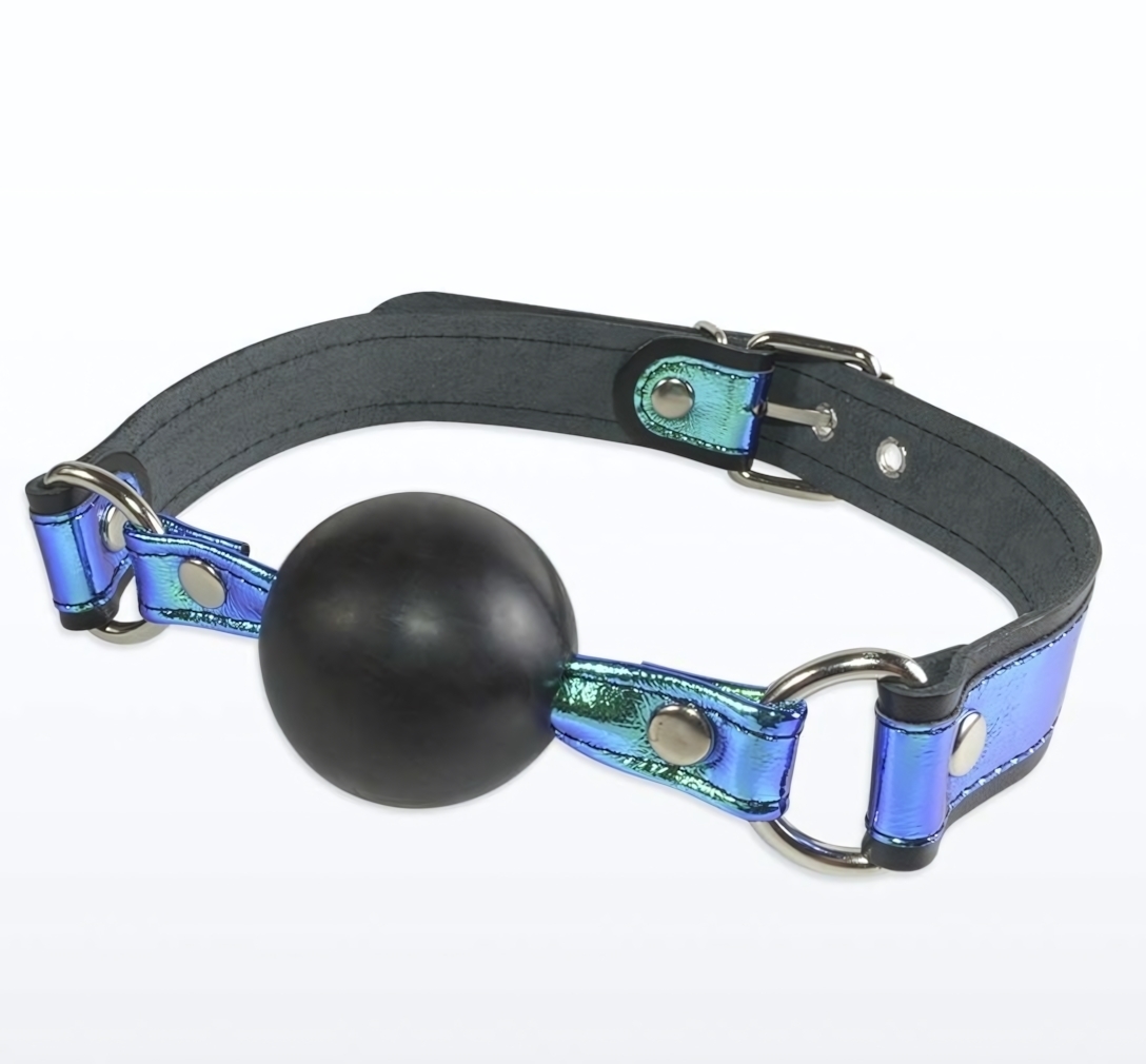 Погрузитесь в мир страсти и новых ощущений с нашим кляпом-шариком, который станет незаменимым аксессуаром для ролевых игр. Этот эффектный девайс выполнен из высококачественной натуральной кожи черного цвета и дополнен яркими ремешками с голографическими вставками синего цвета, которые переливаются изумрудными, салатными и бирюзовыми оттенками. Он не только привнесет в ваши игры элемент загадки, но и обеспечит комфорт и безопасность.
