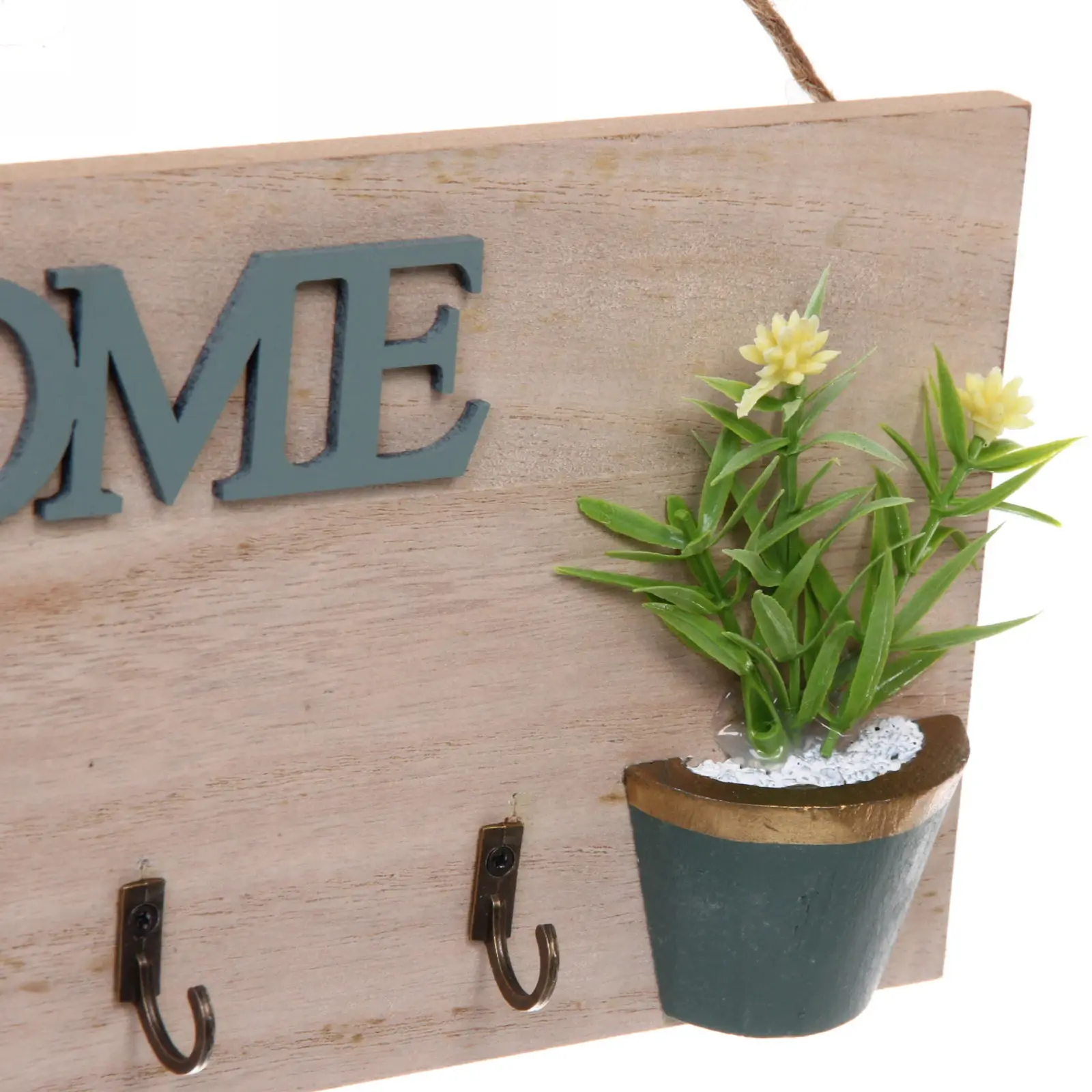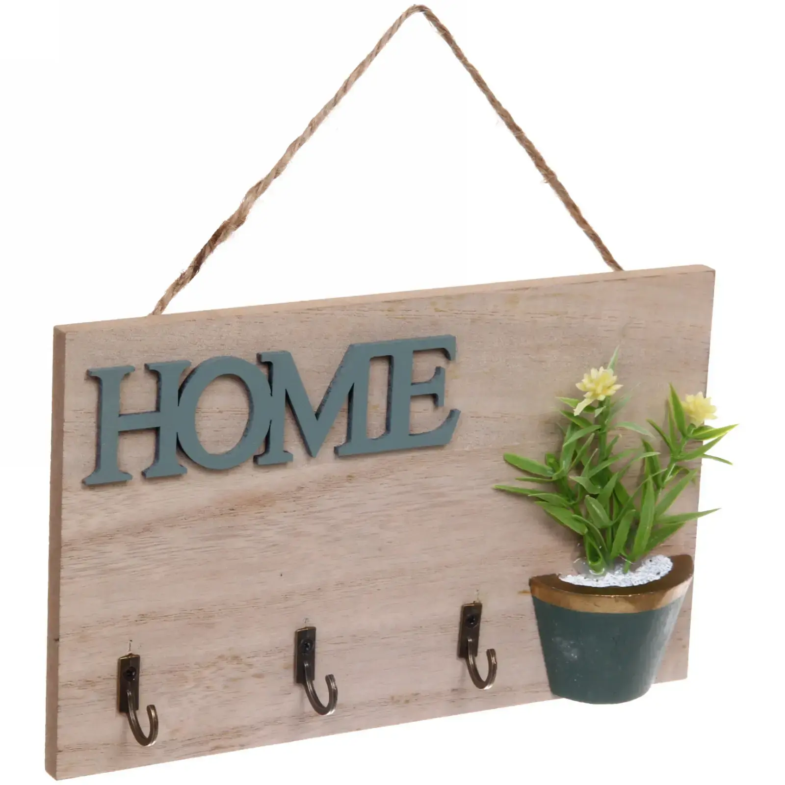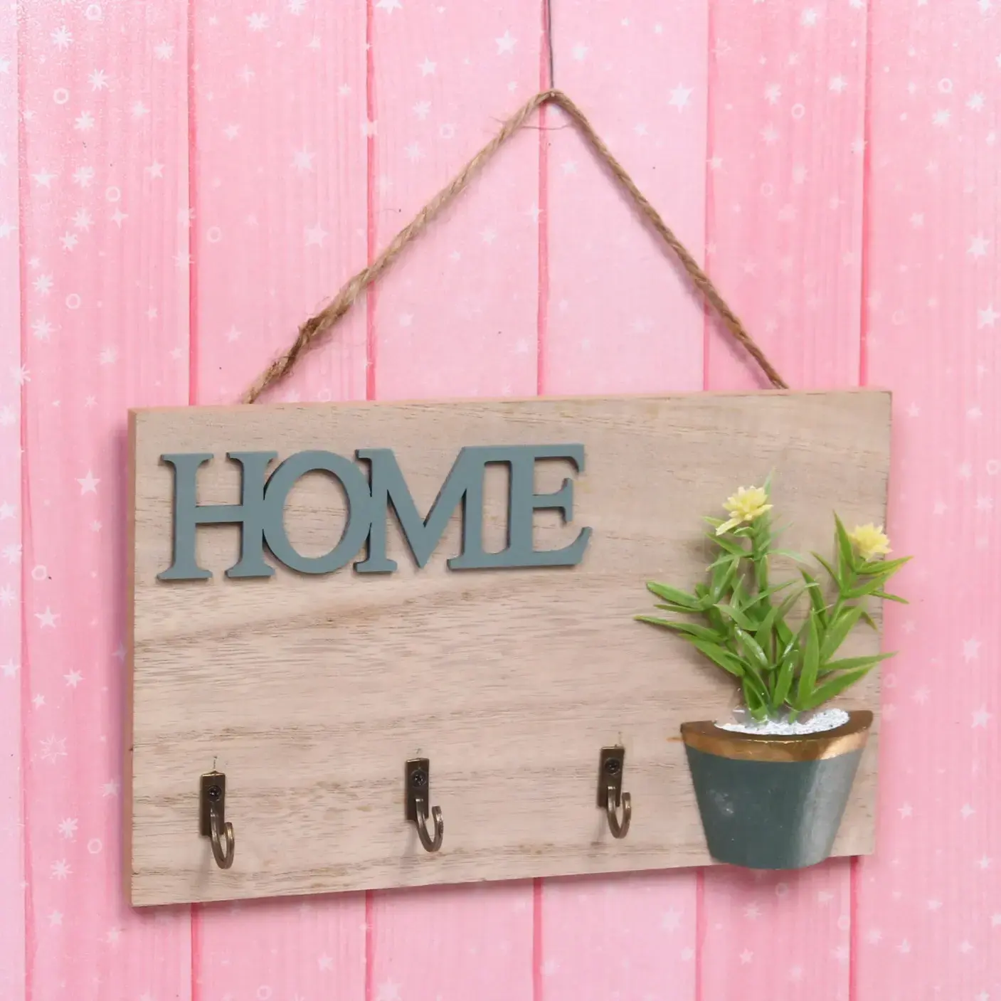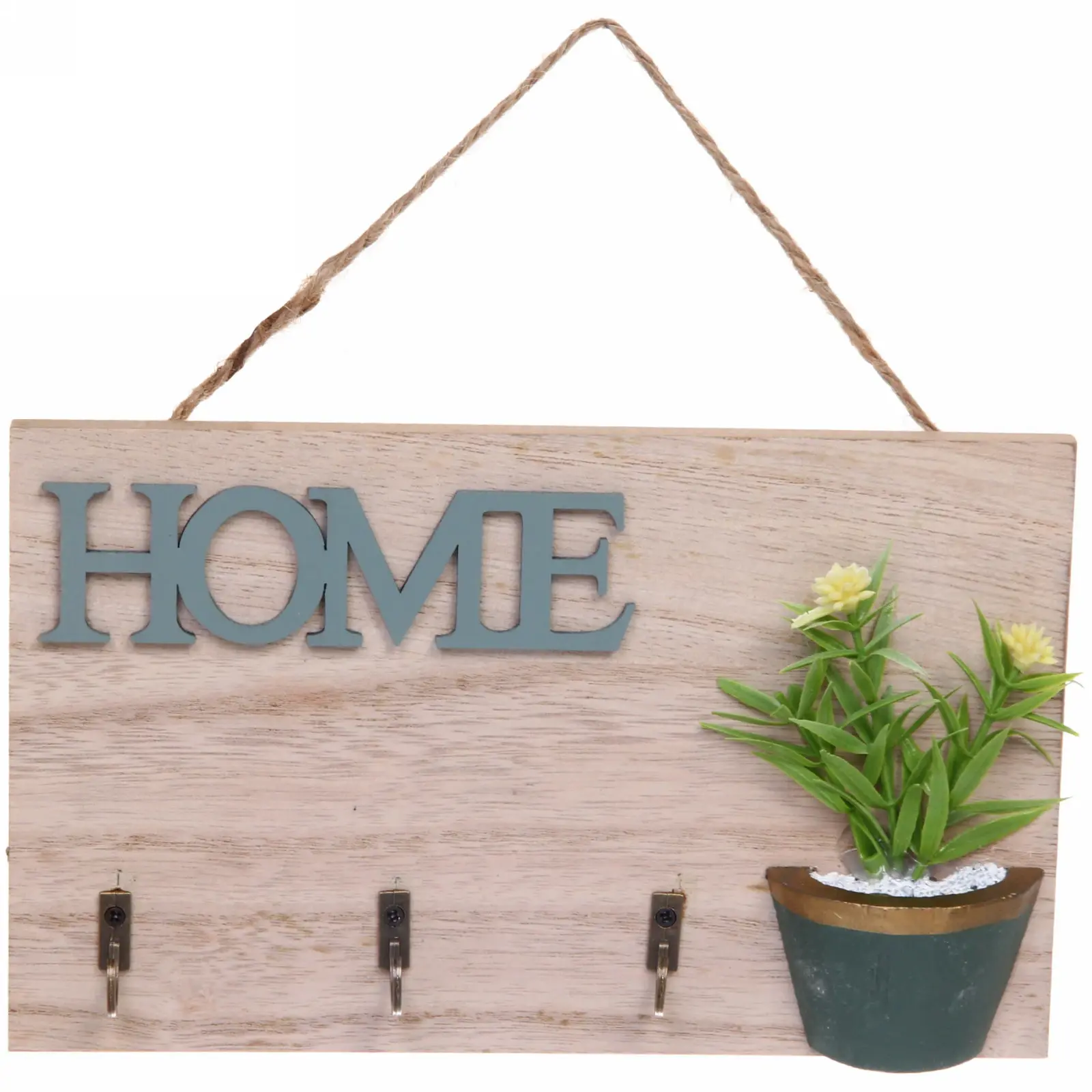 Ключница легко крепится за специальную верёвочную петлю, а наличие декоративных элементов — буков с надписью «HOME» и мини-горшока с искусственным растением — создает уютную атмосферу. Она подходит для размещения в прихожей, коридоре или на кухне, облегчая хранение мелких предметов и добавляя привлекательности интерьеру.