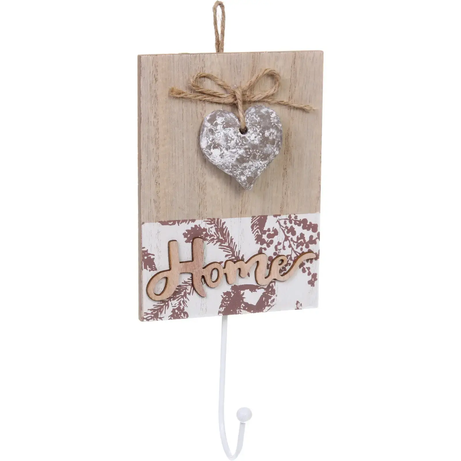 Размер ключницы — 21x9.4 см. Основание выполнено из светлого дерева с трафаретным узором, крючок — белого цвета с шариком на конце. Верх украшен декоративным сердцем из металла на джутовой верёвке, нижняя часть — объёмной надписью "Home". Цвет бежевый, универсально подходит к большинству интерьеров.