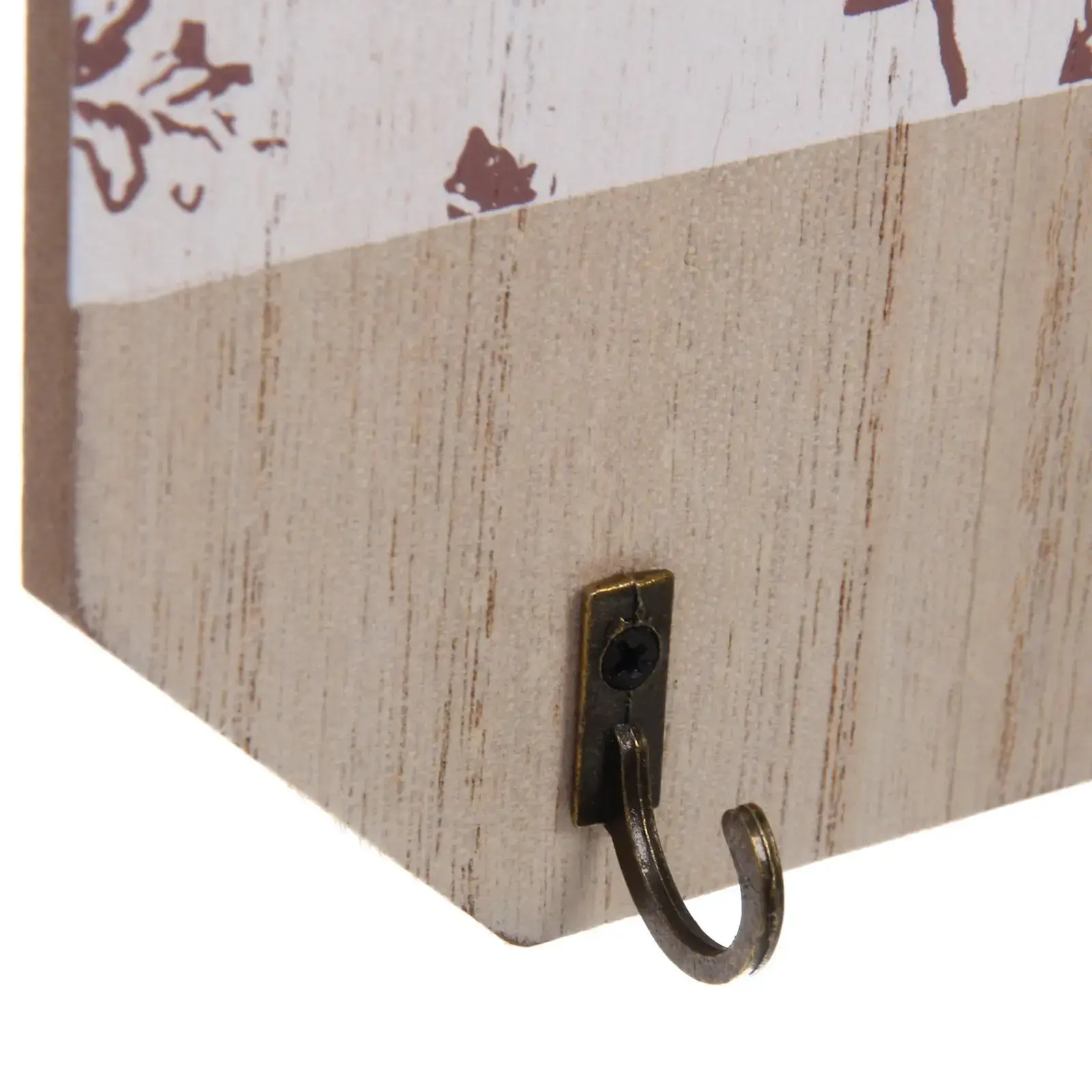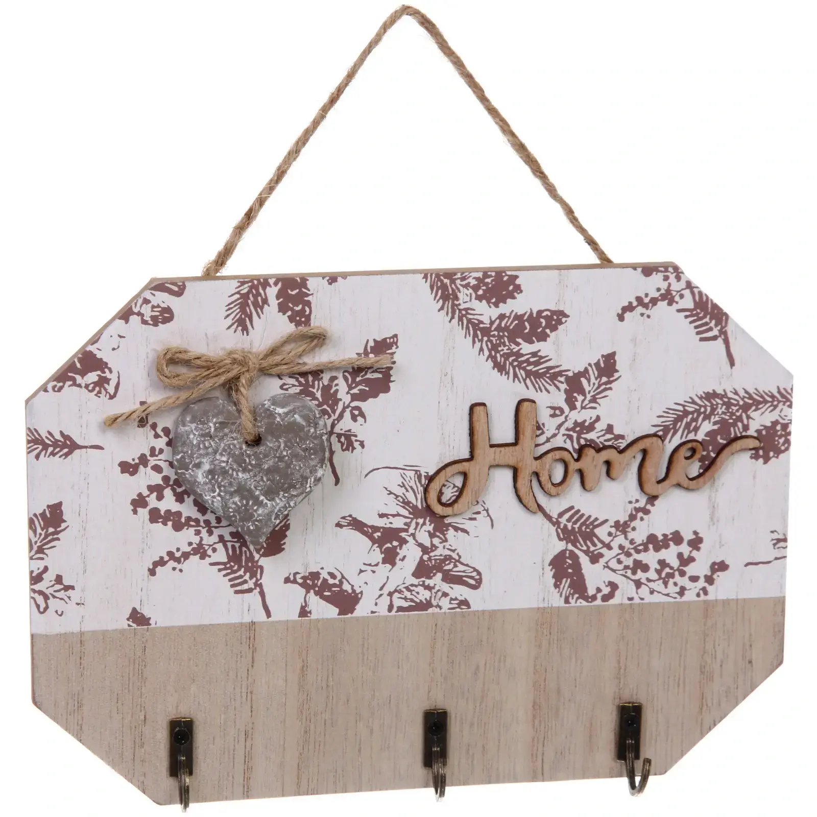 Изготовленная из дерева и металла, ключница отличается долговечностью и надежностью. Светлые тона панели с декоративным орнаментом и подвесным сердечком создают теплое настроение, а слово «Home» придаёт особое чувство домашнего уюта.